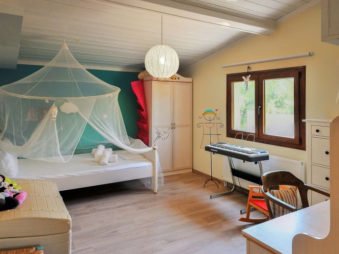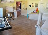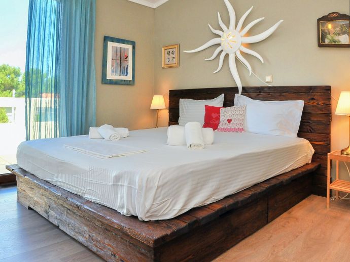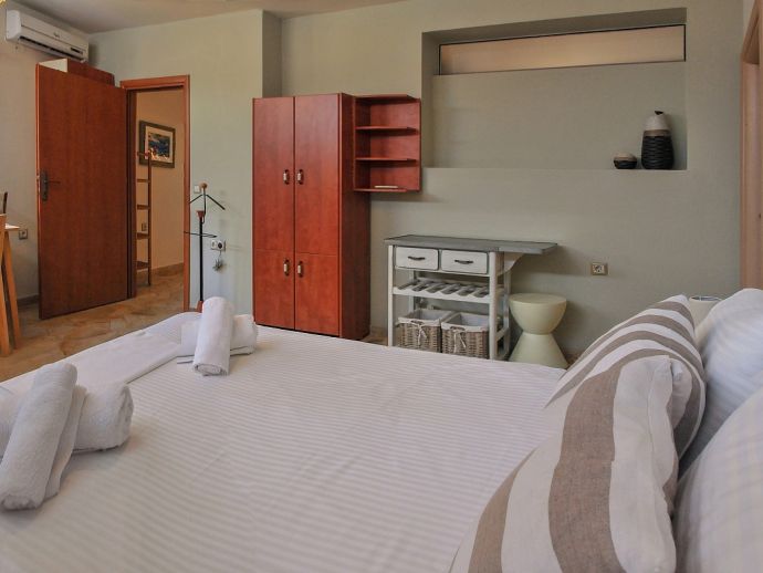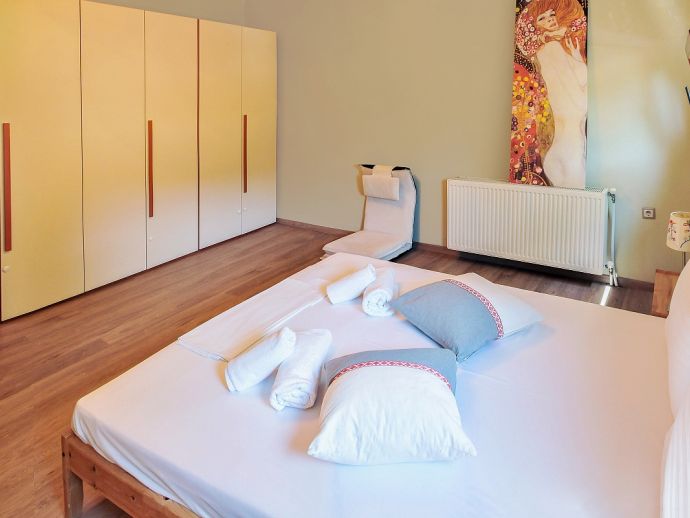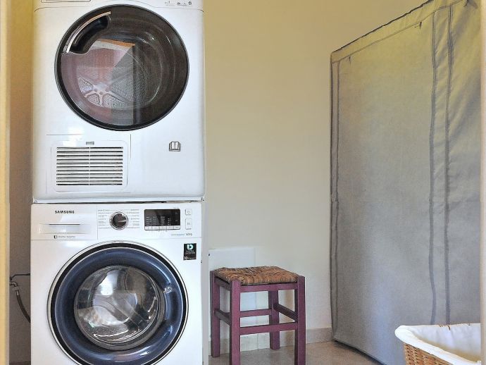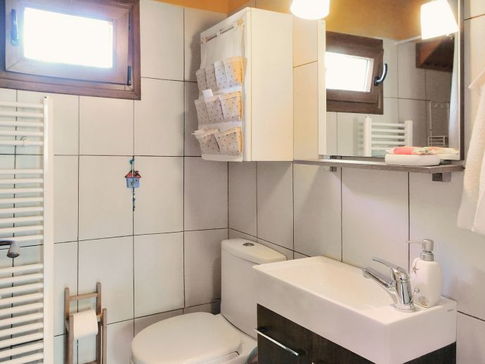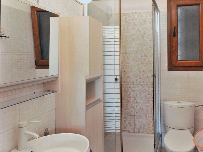 First Floor: 3 bedrooms, 3 with double beds (one has air conditioning). There is additional sleeping, suitable for 2 children in the living room next to one of the bedrooms with a sofa bed and single bed (this is also equipped with air conditioning). One more bathroom upstairs with a bathtub and a room with a washing machine and a dryer.