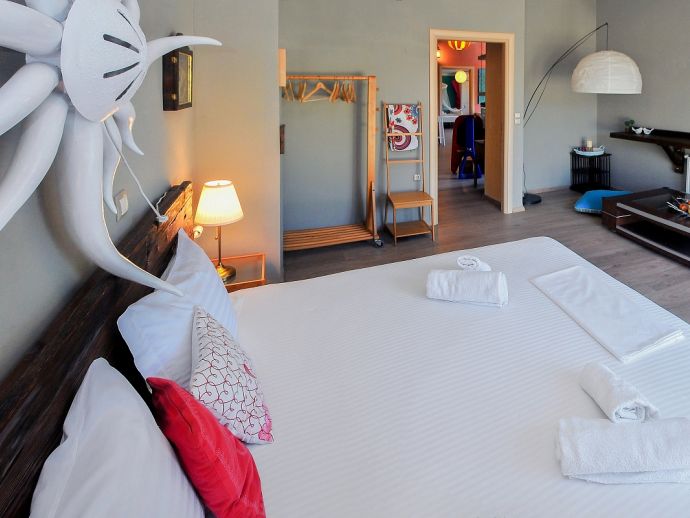The house is built next to Skala Rachoni, between two ports (Skala Prinos and Thassos), which connect the island by ferry boat to Kavala and Keramoti. There is a very beautiful coastline – fine white sand which embraces a series of beautiful coves, all washed by the clear and shallow sea. Pine trees reach right down to the water’s edge and it is always possible to find plenty of natural shade on the beach. On both sides of the road, there is a maze of small country roads, in and out and around the olive groves, often leading to unexpected small coves with fine sandy beaches, restaurants and tavernas.There are beach bars also which will attract both young people and those who feel young at heart, offering daytime and evening parties.