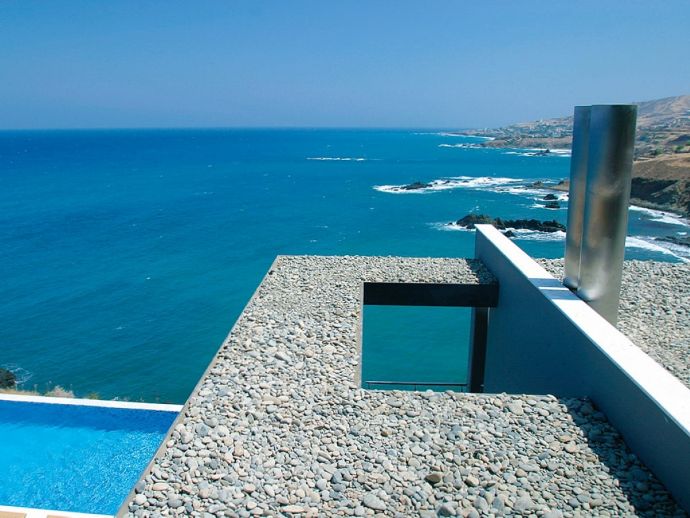 Villa Paradise is set majestically in a unique position on the outskirts of Pomos. Unusual and modern in style this deluxe villa has been designed with luxury and comfort in mind. Capturing the light and spectacular sea views it is guaranteed to leave you breathless. From the parking area, steps lead down to the magnificent balcony which encircles the entire villa, giving access to the captivating view of the cool blue Mediterranean waters. This single level villa comprises of a spacious open plan living area with an unusual glass fireplace, Smart TV, 3 spacious bedrooms with en-suite facilities, a guest toilet and a modern fully equipped kitchen. The ample outside area has a patio area and a purpose built barbecue which is ideal for entertaining and those who enjoy al-fresco dining. The decked poolside is the place for the sun-worshippers with the infinity pool being ideal for cooling off and the Jacuzzi and Sauna room is a perfect place for relaxation. Tucked away at the end of the deck is a romantic alcove retreat to enjoy those quiet moments with a cool glass of wine.