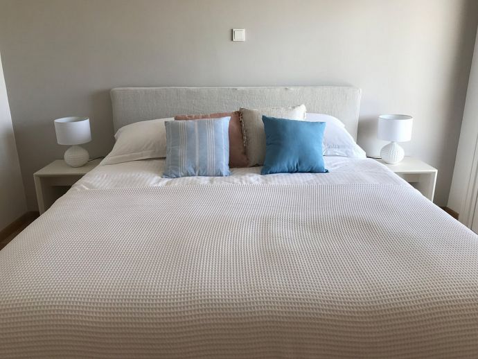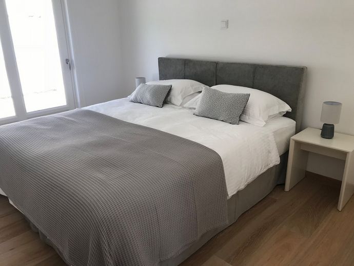 Bedroom: King Size Coco-Mat bed, built in wardrobe with safe, 2 x French windows to balcony with sea view