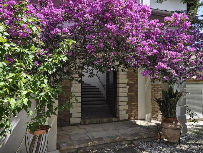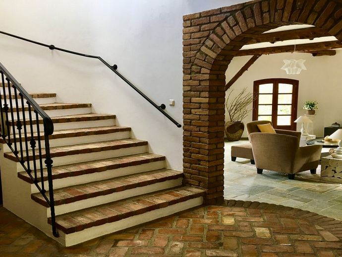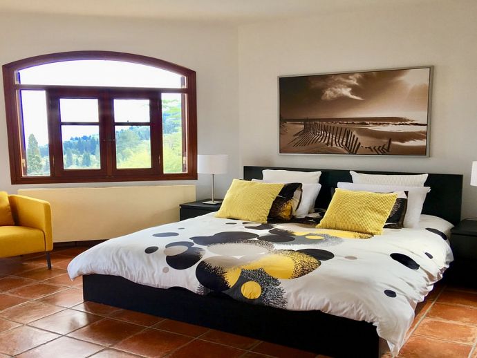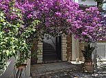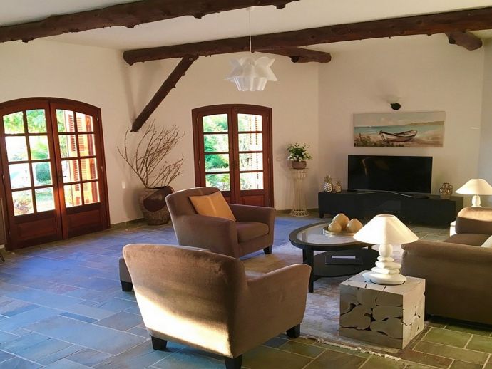 Set in lush private gardens of almost 5000 m² - tropical foliage with palm trees, yuccas, 20 olive trees and surrounded by tall pine trees.