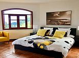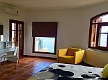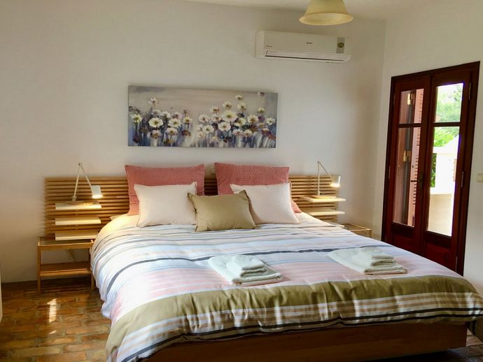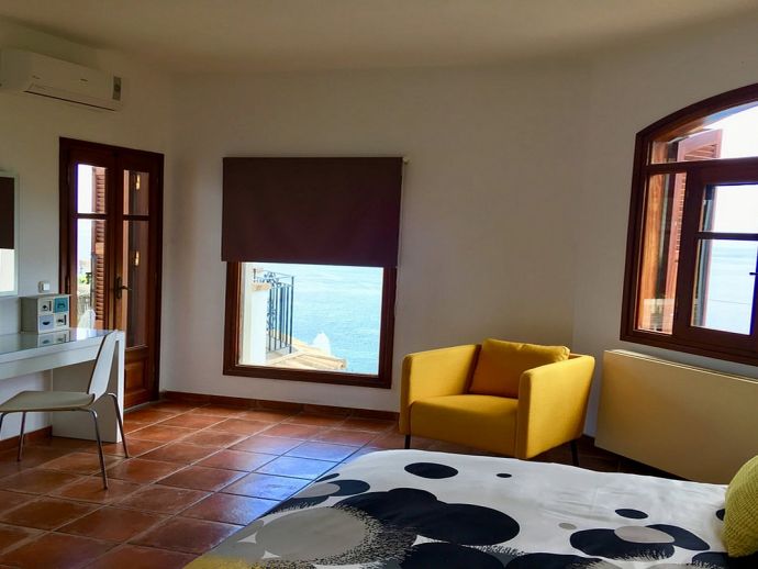 Bedroom: 1 x super king size bed (1.80 wide), with French windows leading out onto a large balcony overlooking the sea (an extra single bed can be added on request).