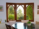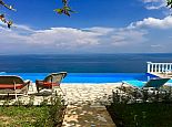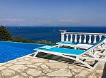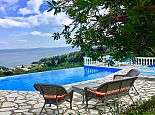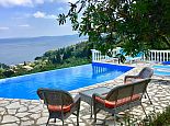 Lara Villa sits in an elevated position high above the sea, enjoying the best views of South East coast, they are simply spectacular. This lovely villa of traditional Mediterranean architecture sleeps 5 guests, it is well located and extremely private with a circular design and windows providing panoramic sea views. On entering you are met by a grand staircase of antique brick which winds up the centre of the building giving a light and airy feel. On the ground floor there is a large kitchen with oak cupboards and tiled tops and a mesmerising view from the marble sink, a door gives access onto the outside dining area, built in barbecue and pool. All the modern appliances are here such as electric oven with ceramic hob, dishwasher, microwave and tall fridge/freezer. Off the kitchen there is a circular dining room with lots of windows enjoying the views and on a slightly lower level a large spacious sitting room with fireplace, (satellite TV with a selection of British & European channels) again of circular design with numerous windows. Through the French windows the infinity pool blends effortless into the sea below with the sky above creating an illusion of three shades of turquoise. The ground floor also provides a double bedroom and a modern family shower room. The huge Master bedroom of circular design is on the first floor with French windows leading out onto a very large balcony overlooking the sea. A smaller single bedroom is also on the first floor plus a large family bathroom with walk in shower enjoying more spectacular views. Lara Villa is situated up a secluded driveway and set in lush private gardens of approximately 5000 m², its privileged location gives you easy access to traditional Greek villages, fantastic beaches and is an ideal choice for memorable holidays spent in Corfu.
