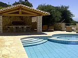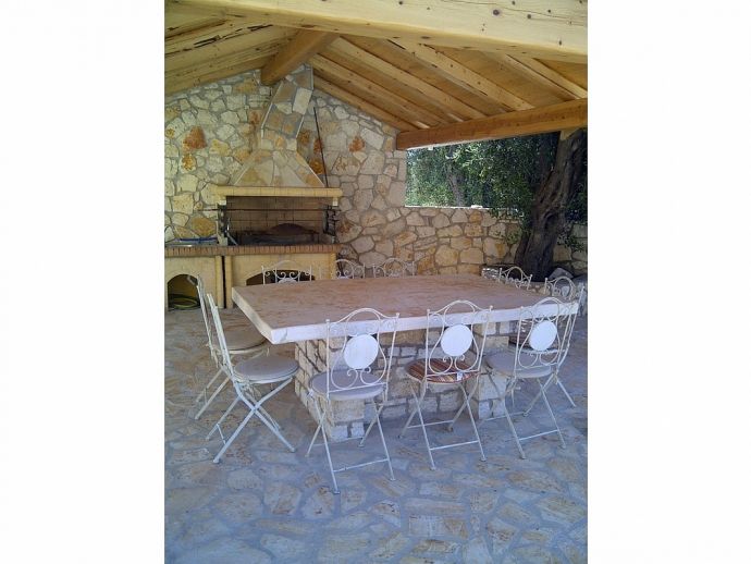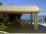 Covered barbecue and kitchen area with stone table and seating for ten with spectacular sea views.