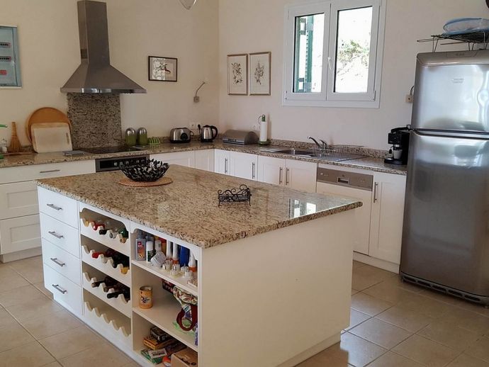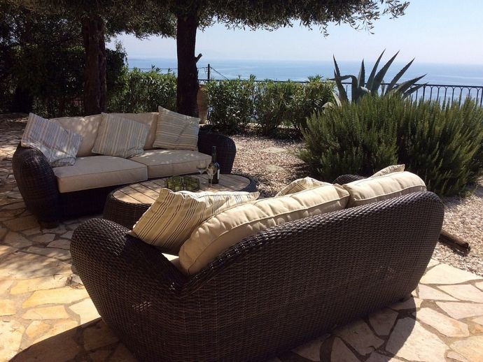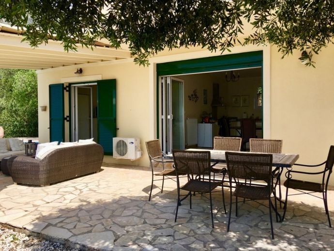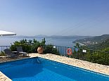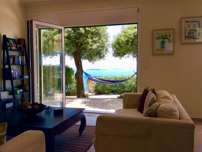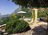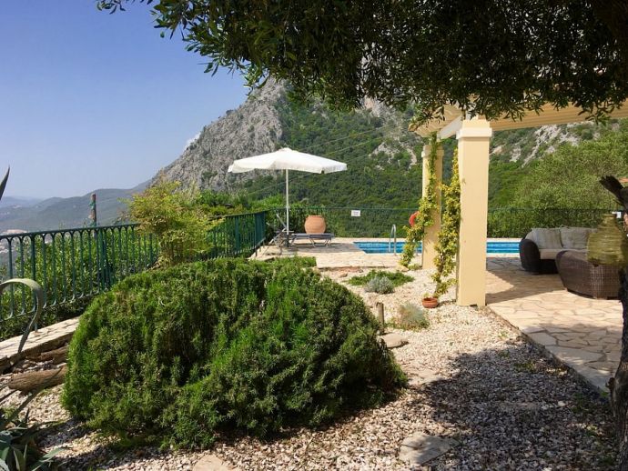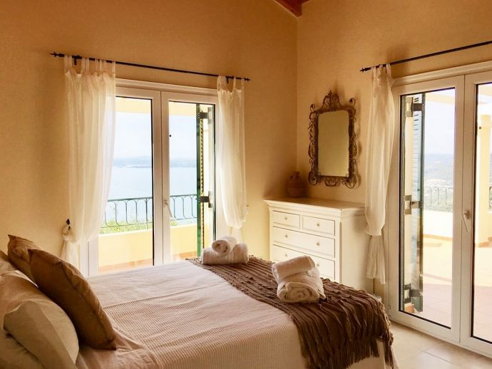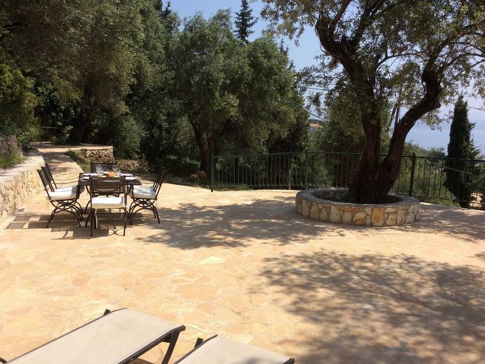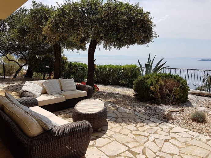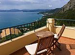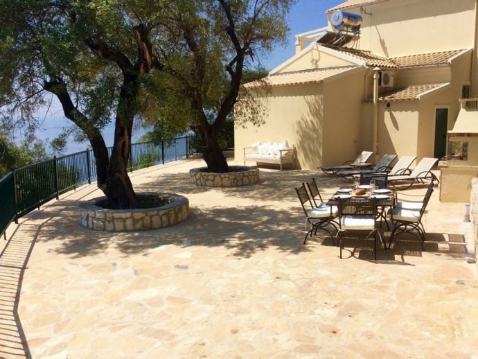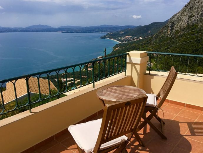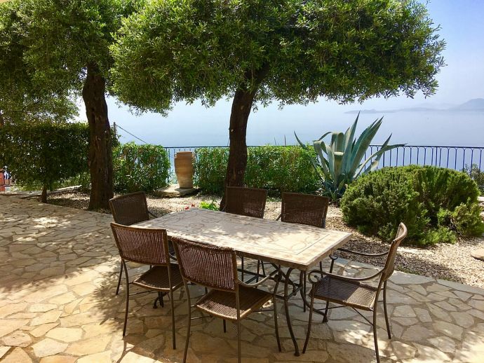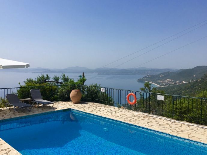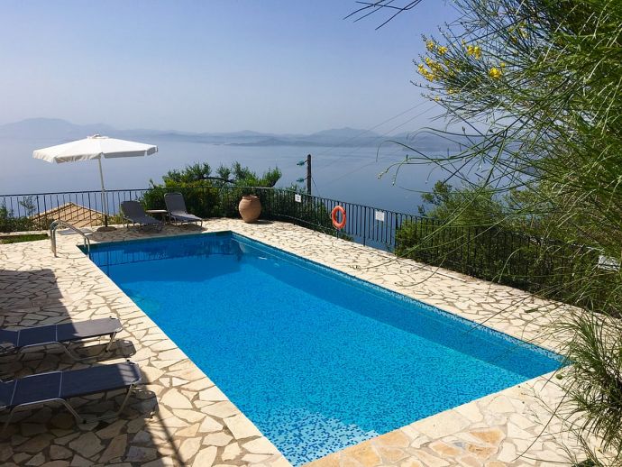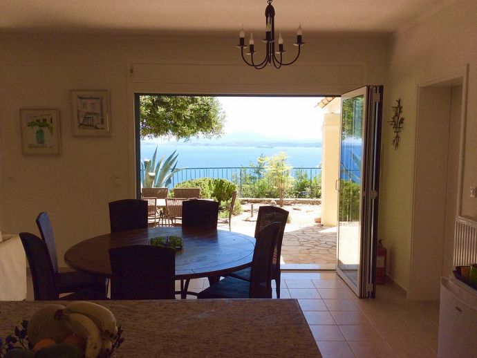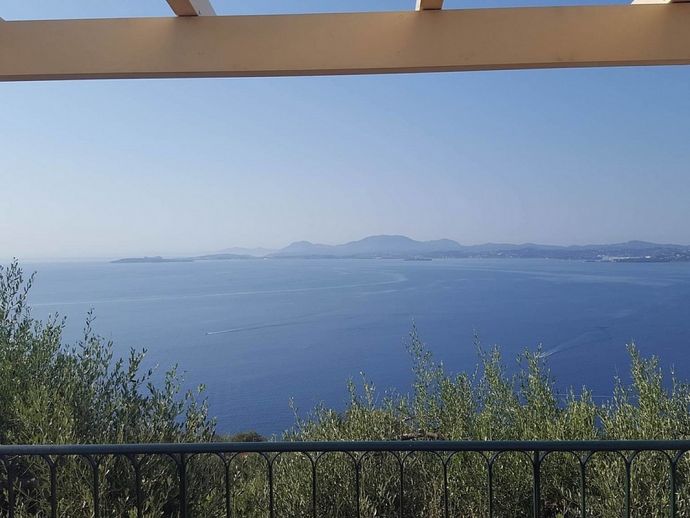 Villa Acantha has stunning mountain and unobstructed sea views and sits in an elevated position above the peaceful village of Nissaki. The interior has been lovingly furnished to an exceptionally high standard with the majority of the furniture being shipped from abroad resulting in good quality mattresses ensuring a comfortable nights sleep in the 3 bedrooms with en-suite bathrooms. All bedrooms benefit from sea views and glass doors to the outside, the first floor bedroom has dual French doors to balconies/large terraces and wonderful views. The villa has air conditioning, WiFi and Mosquito nets fitted to all windows. The luxury, high quality and well equipped kitchen with centre island, units with granite worktops is fully fitted with integral electrical appliances (electric oven, ceramic hob, overhead extractor fan, dishwasher, tall fridge/freezer) and the open plan lounge has comfortable sofas and a flat screen wall mounted TV (satellite - all UK and European speaking channels). The recent addition of two sets of large concertina windows in the sitting room enhances the amazing view which can now be enjoyed from all corners of the sitting room, dining room and kitchen. The grounds are extremely private with extensive patio areas around the large pool and some shaded areas to relax amongst the olive groves and for those who enjoy dining at home there is a large brick built barbecue and two separate outside dining areas with sea views. Villa Acantha has an excellent location for exploring this enchanting area of Corfu and the views from both the terraces and the spacious balconies are spectacular, the turquoise sea stretches out below and you can sit for hours enjoying the sailing boats returning to the marina or the sight of cruise liners arriving into Corfu Town just across the bay.