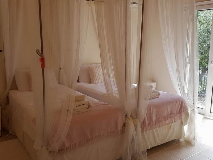 Bedroom 2: Twin four poster beds, bedside cabinets, wardrobe, French doors with sea views.