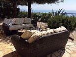 Wicker lounge furniture, dining furniture, a large brick built barbecue and two separate outside dining areas with wonderful sea views.