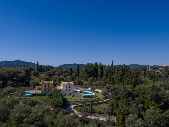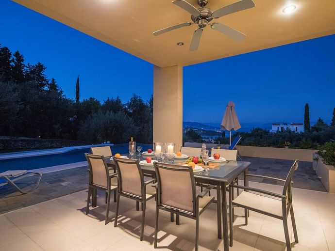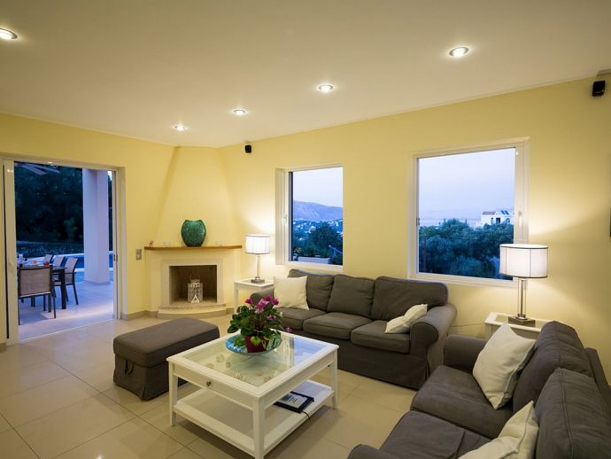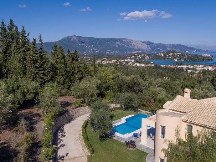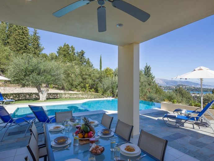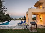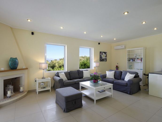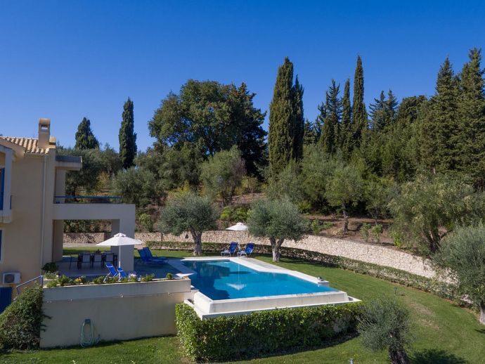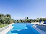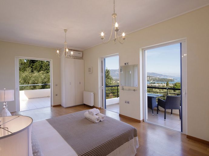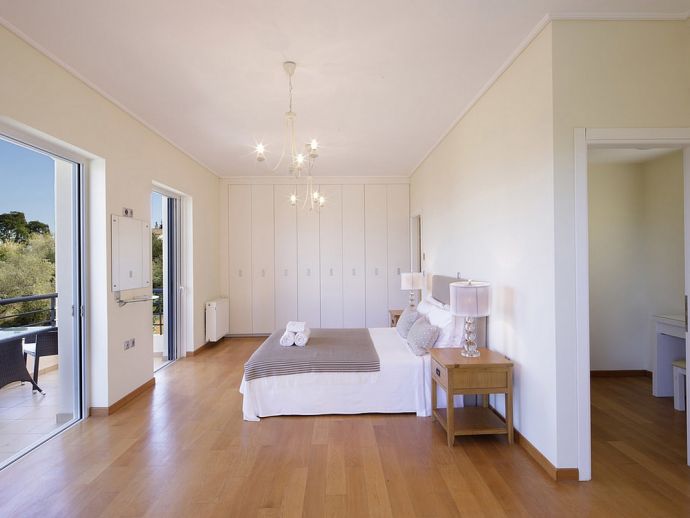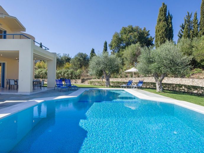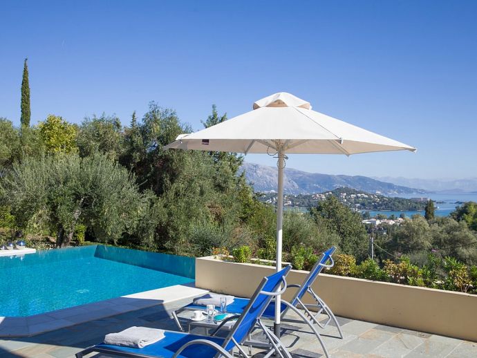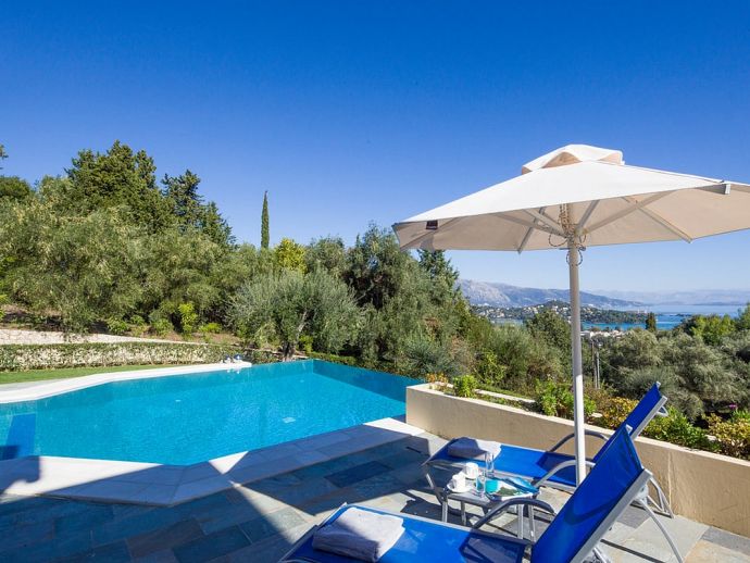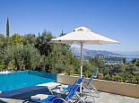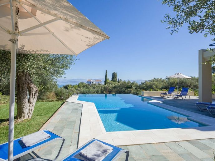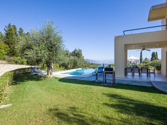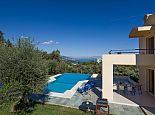 Villa Petrina is located just a 3 minute drive to the family resort of Gouvia and has spectacular sea views to the Marina, the north east coast and the peninsular of Kommeno. The property is one of two identical, adjacent and contemporary villas that can sleep up to 8 guests each (there are no shared facilities and the gardens, entrance and pool are all completely private), accessed via their own electric gates a long sweeping driveway through landscaped and manicured gardens leads you to the house and the impressive private horizon/infinity swimming pool which is set in marble and has fabulous views. No expense has been spared in the design and build of the villas with fixtures and fittings of the very highest standards and each one has 4 air conditioned bedrooms, 3 bathrooms plus a guest toilet (mosquito nets are fitted to all windows). The extremely large master bedroom occupies the majority of the first floor and has three individual sliding glass doors onto the large balconies with views of the sea and to Gouvia Marina, there is an en-suite bathroom and a dressing room/nursery, three further bedrooms and two bathrooms are located on the lower ground floor with views of the gardens. The fully equipped kitchen has modern units with granite worktops and high quality appliances (oven with halogen hob, integrated fridge/freezer, dishwasher, microwave plus a coffee machine, toaster, kettle) and there is a separate utility room with laundry facilities. The comfortable lounge with fireplace (Sony Ipod docking station, Samsung LED TV with Media system/DVD, Sky TV and wall mounted speakers) has sliding glass doors opening onto the veranda and pool area with beautiful coastal views. Villa Petrina can be rented in conjunction with Villa Marylis so ideal for either multiple groups of couples or families looking for high quality upmarket accommodation for a group of up to 16 guests who wish to share holidays together but still maintain their own privacy and independence at the same time.