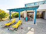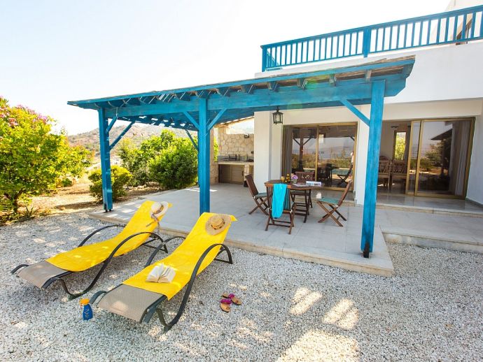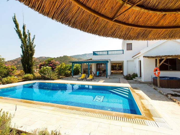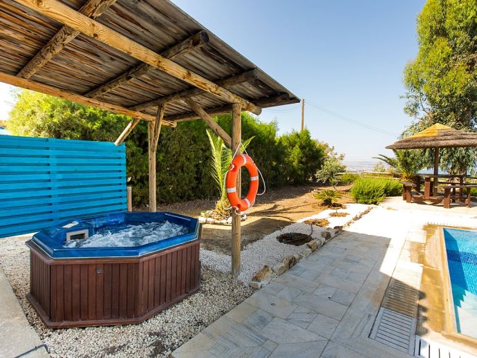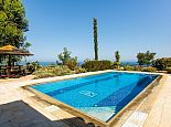 Villa Kyrene is an attractive holiday villa in Cyprus set amongst lush greenery with spectacular sea views overlooking the large sweeping curve of Chrysochou Bay from Latchi in the west (with the smoky silhouette of the hills of the Akamas inland) to the fishing harbour of Pomos to the east. The house is perfect for families with versatile sleeping arrangements consisting of a double bedroom on the upper floor with en-suite bathroom and direct access to a sea view terrace plus a twin bedroom on the ground floor, a cot can also be provided for an infant (maximum occupancy 5). Also on the ground floor is a second bathroom, a fully equipped kitchen and an open plan living and dining area with a Smart TV and glass doors that open out to the private garden with swimming pool and Jacuzzi (hot tub). Whilst meals can be enjoyed in local eateries, the villa has it's own built-in barbecue and al fresco dining facilities which are perfect for memorable evenings shared together in a lovely setting with magnificent views.