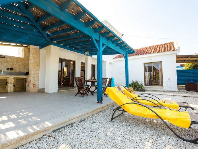 Covered terrace with outside dining area and built-in charcoal barbecue.