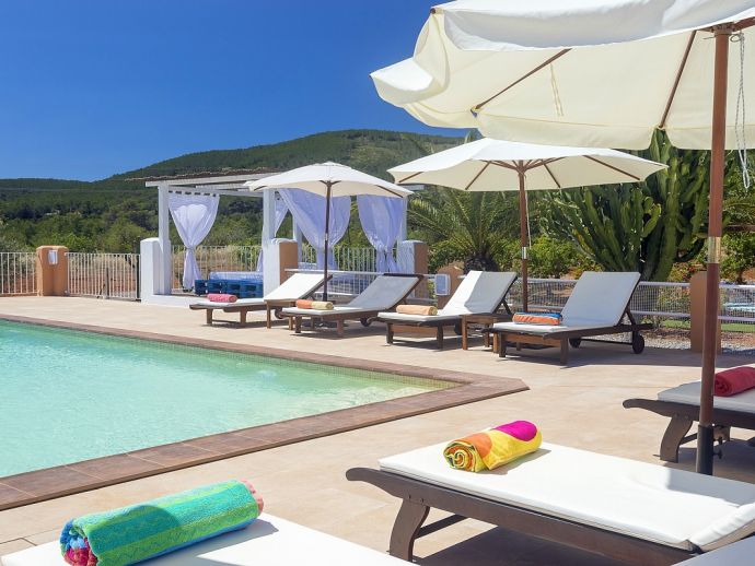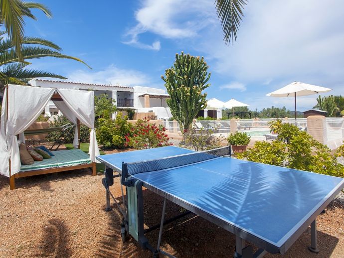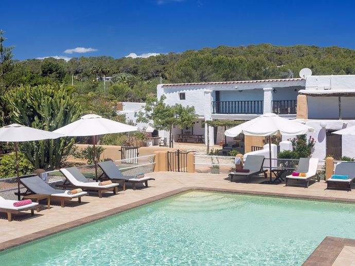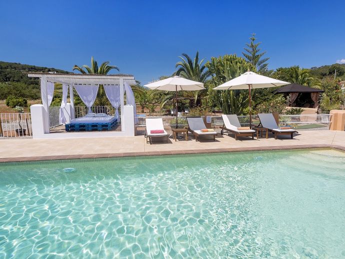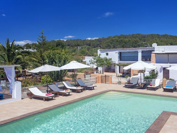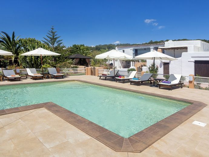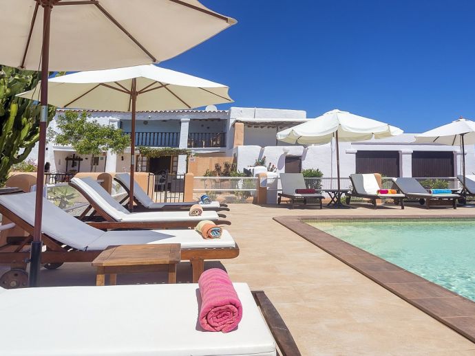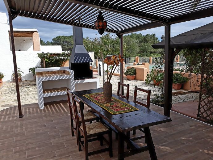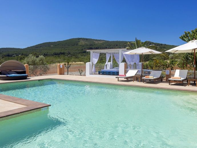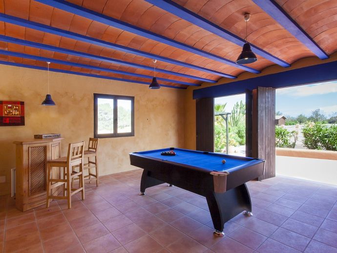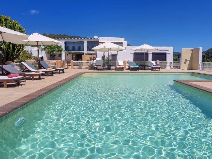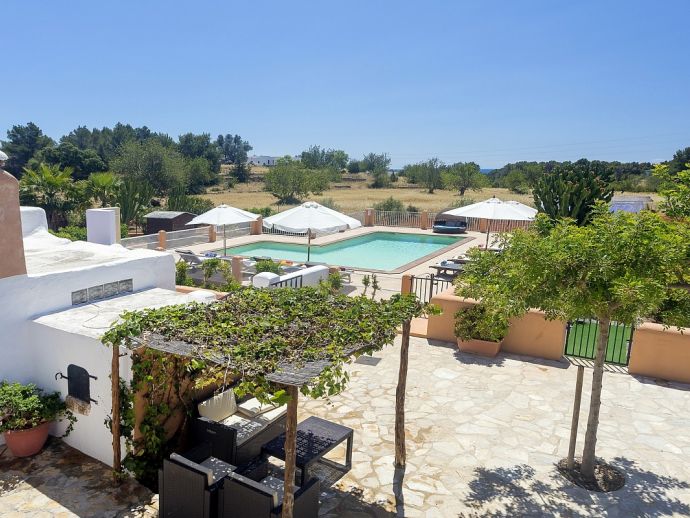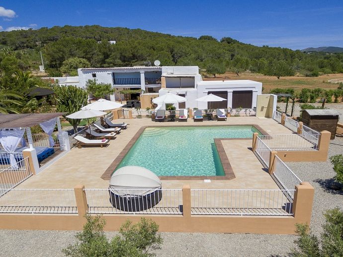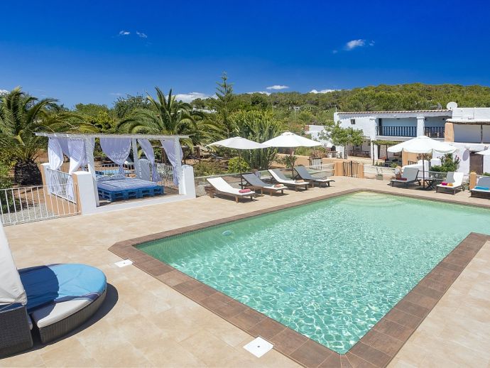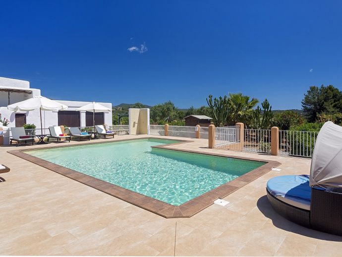 Villa Amelia is a lovely traditional house in a quiet countryside location just 2.5 km from the beautiful town and beach resort of Santa Eulalia. It has been recently restored with careful thought selecting furniture throughout, in a rustic style and exquisite taste ensuring that it matches with the typical ibicencan architecture. Distributed over two floors the house sleeps 8 in comfortable air conditioned accommodation, on the first floor is a twin bedroom and a covered terrace with views to the countryside and sea. Three further bedrooms with en-suite bathrooms (2 doubles /1 twin) are located on the ground floor and accessed from the large lounge along with a complete kitchen and separate dining room, there is also WiFi, air conditioning, heating, a plasma TV in all rooms, satellite TV, a safe, I-phone dock station and alarm system. Outside is patio area including porch which is full of beautiful potted plants, from here there is access to a shower room complete with washing machine. Villa Amelia sits on a large plot with a fenced private swimming pool, sun terrace equipped with loungers and "Bali" bed for relaxation, table tennis and a pool table for entertainment and a built-in barbecue with dining furniture for enjoying meals al fresco.