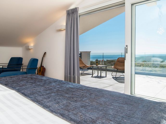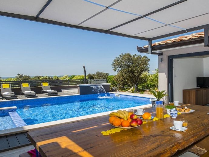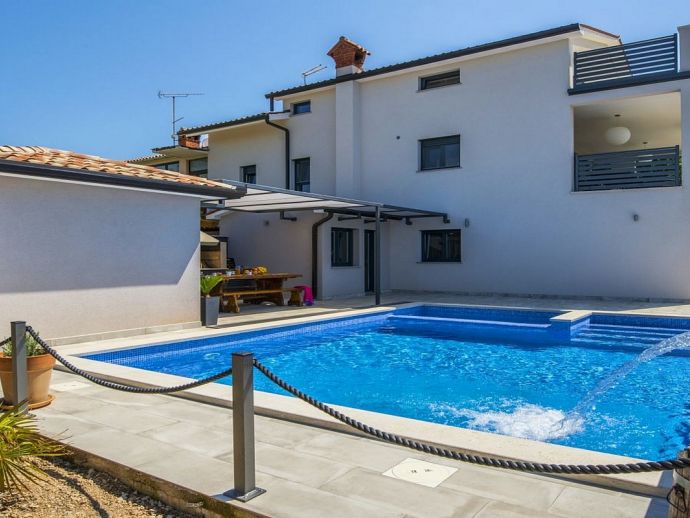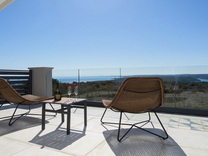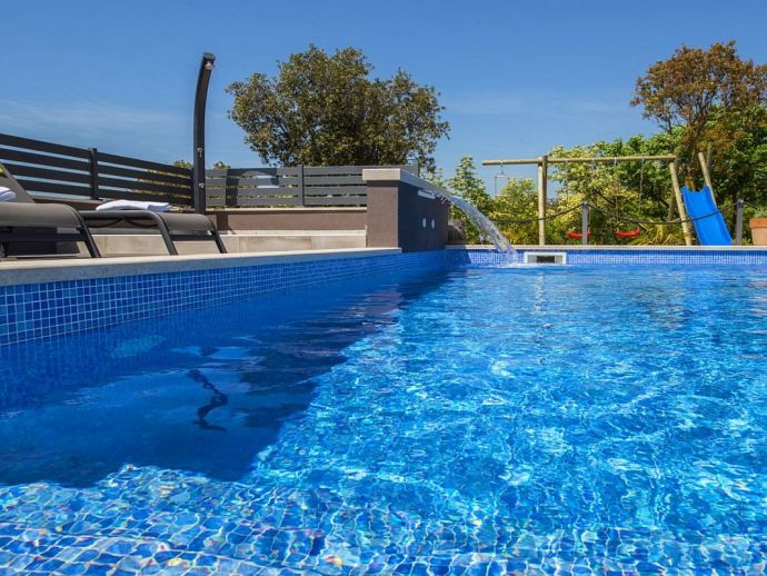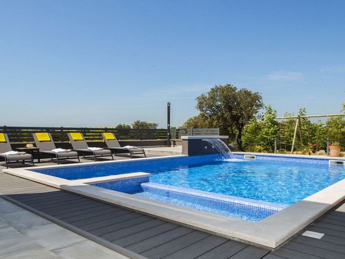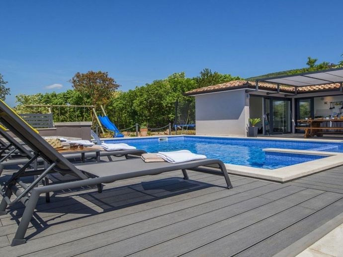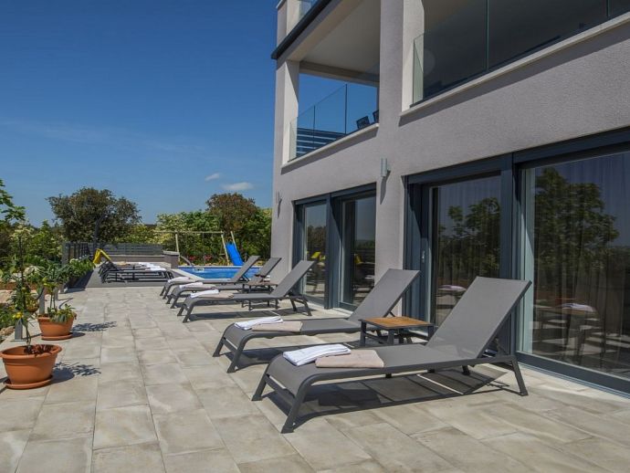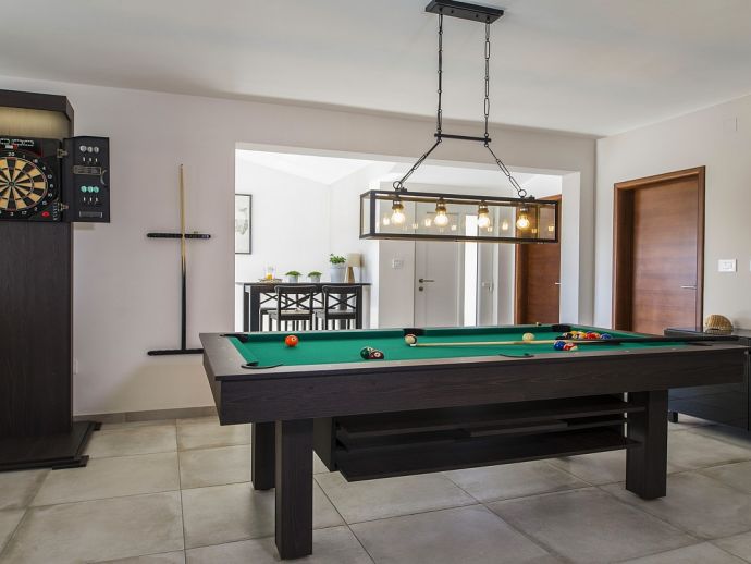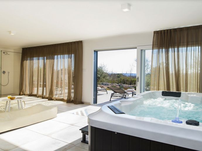 Villa Zana is a newly built modern property situated on the eastern coast of Istria with magnificent sea views which will make you fall in love with the Mediterranean sunsets that can be enjoyed from the balconies and terraces. The luxury and sleek interior provides a comfortable atmosphere to accommodate 9 guests, with 5 bedrooms and 5 bathrooms including a master suite on the top floor with a large terrace and panoramic sea views. There are 2 bedrooms and 2 bathrooms on the first floor and the main open plan living area with lounge, dining table, a fully equipped connected kitchen and patio doors to an attractive furnished terrace also with fantastic sea views. The ground floor houses to 2 more en-suite bedrooms, utility room, guest toilet plus spaces designed for pampering, light exercise and fun. A games room with a pool table and darts, a fitness room and a well-being room with a Finnish sauna and Jacuzzi which opens out to the private swimming pool, terrace with outdoor kitchen, dining and barbecue area. The enclosed garden includes a children's play area and table tennis making Villa Zana ideal for families or groups and a perfect place to spend your holidays in peaceful, relaxing and beautiful surroundings.