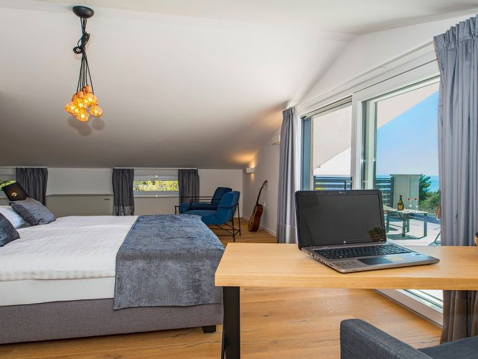 • Spacious master double bedroom with terrace and sea view (deck chairs), A/C • Shower room •