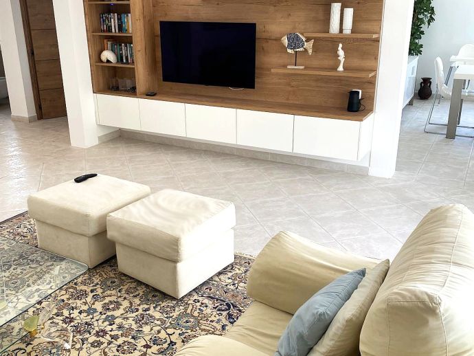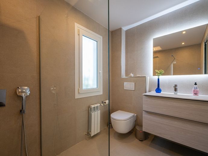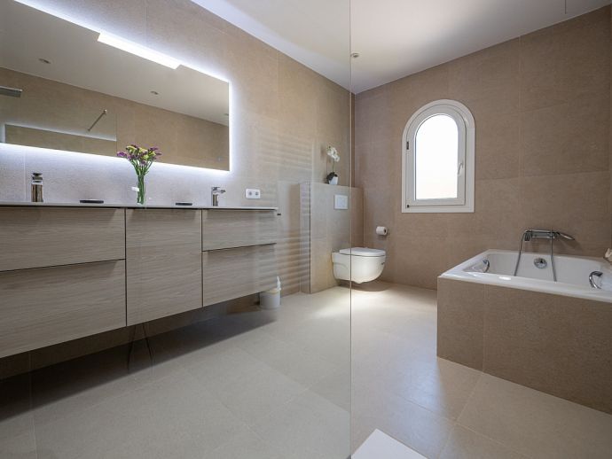 Exclusive villa with a perfect location, private pool (5 x 10m), beautiful green garden, multiple terraces and sea views. With 3 bedrooms, each with double bed, private terrace, air-conditioning and en-suite bathroom, the villa offers accommodation for 6 +1 persons. The spacious suite on the ground floor has a king size bed, HD flat screen TV and a comfortable sleeping sofa bed for 1 adult or 1 child, also a private terrace with table and chairs to enjoy breakfast in privacy. The bedroom has a direct access to the garden with swimming pool. On the first floor are 2 more bedrooms with double bed, the "Master" bedroom has a HD Flatscreen TV and en-suite bathroom with a bathtub and shower and the 2nd bedroom has an en-suite bathroom with shower. The living room is very spacious and luxuriously decorated with stylish lounge furniture, a fireplace and a flat-screen TV (LG 48 Inch OLED Smart 4K UHD HDR Freeview TV). Sliding glass doors lead from the living room to a spacious terrace for outdoor meals and there´s a direct access to the garden and pool. There is also a separate dining room. The kitchen is fully equipped with ceramic hob, microwave, dishwasher, coffee maker, kettle, all cooking utensils etc, .. washer and dryer are located in a separate utility room.