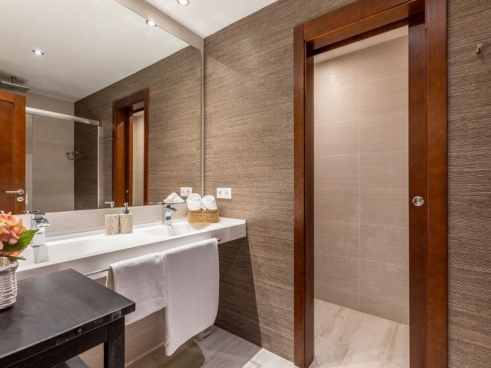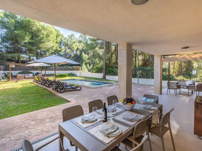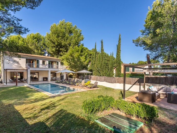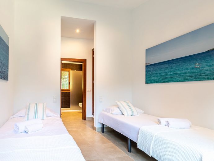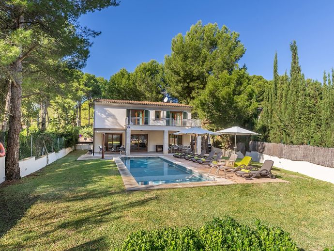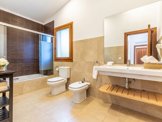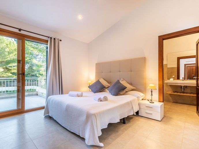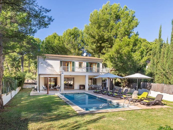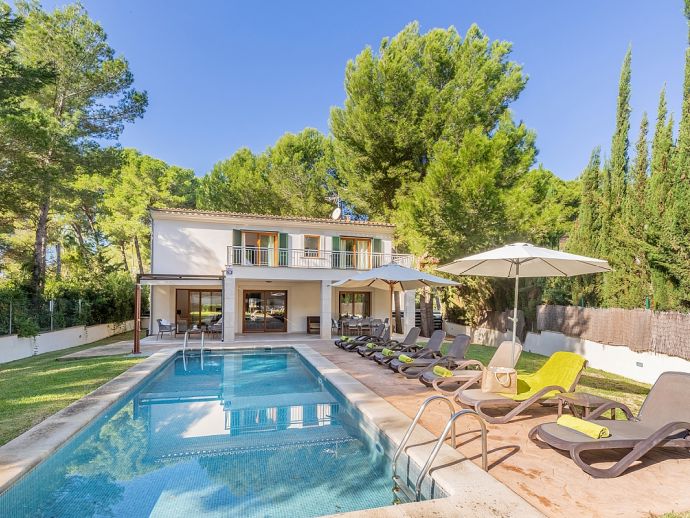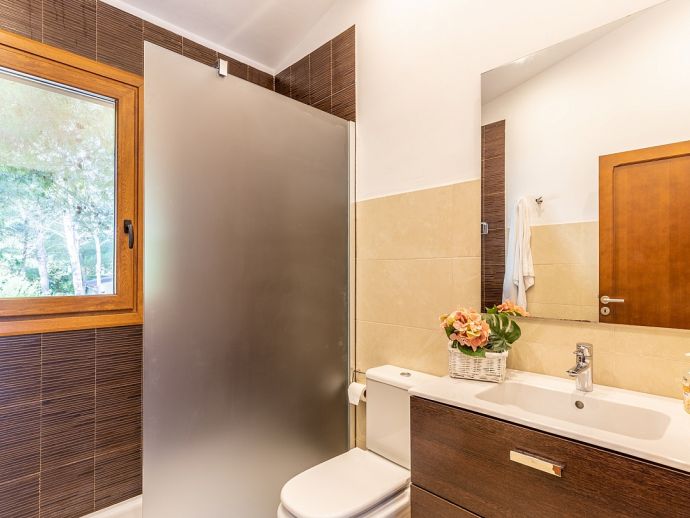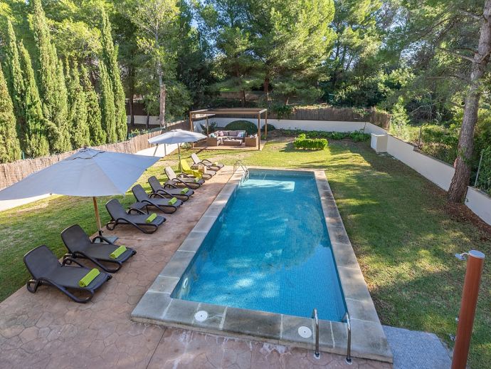 Casa Natalia is perfect choice for a family holiday, situated in a friendly neighbourhood and within easy walking distance to safe beaches and good restaurants. This new build villa sleeps 8 guests and is modern and tastefully furnished throughout with large glass doors leading out from the living area and kitchen to the private garden with swimming pool. Distributed over two floors, there are 4 bedrooms (air conditioned) and all have private bathrooms, the master bedroom and the twin bedroom also benefit from a large shared first floor balcony with views across the garden. There is another bedroom on this floor and the fourth bedroom is on the ground floor along with the main living area, an open plan living/dining room with Satellite TV (Spanish, English), a separate fully equipped kitchen and utility room with appliances (washing machine, tumble dryer, fridge/freezer, wine fridge, microwave, oven, dishwasher, coffee maker, toaster, kettle, juicer, kitchen utensils, dishes/cutlery). In addition to the fantastic pool the outdoor space is great for sharing meals with a covered dining area, barbecue and comfortable furniture to chill out afterwards. Casa Natalia has everything to offer and won’t disappoint for a memorable holiday spent in Mallorca!