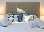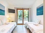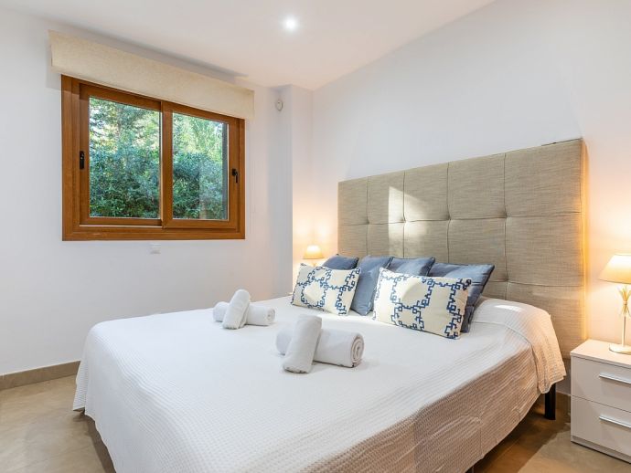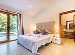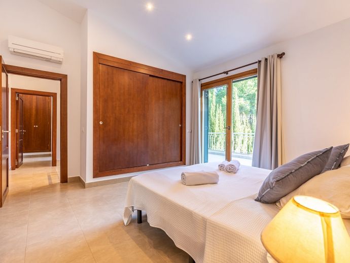 Master Bedroom: 1 double bed, A/C, en-suite bathroom, patio doors to a spacious balcony (shared with twin bedroom) overlooking the garden