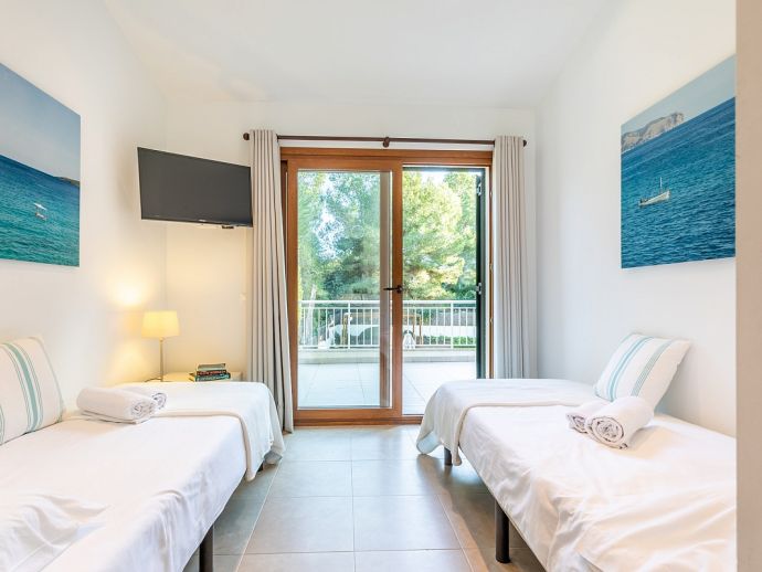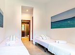 Bedroom: 2 x single beds, A/C, en-suite wet room, direct access to a spacious balcony (shared with master bedroom) overlooking the garden