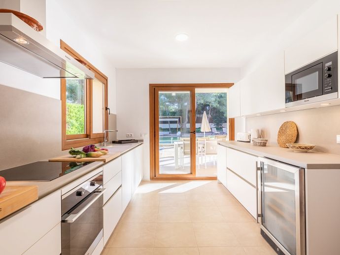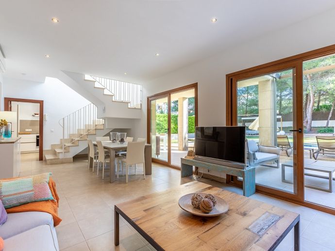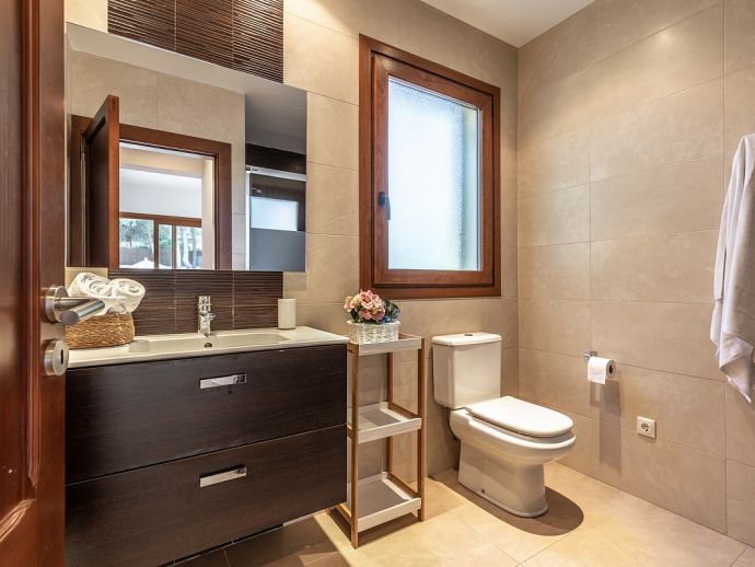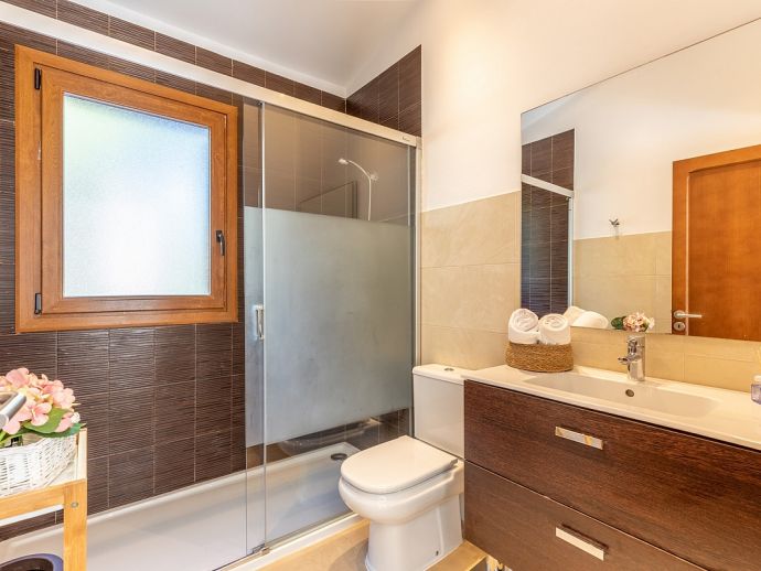 Villa Viviana is perfect choice for a family holiday, situated in a friendly neighbourhood and within easy walking distance to safe beaches and good restaurants. This new build villa sleeps 6 guests and is modern and tastefully furnished throughout with large glass doors leading out from the living area and kitchen to the private garden with swimming pool. Distributed over two floors, there are 3 bedrooms (air conditioned) and all have en-suite shower rooms, two of the bedrooms also benefit from a large shared first floor balcony with views across the garden. The third bedroom is on the ground floor along with the main living area, an open plan living/dining room with Satellite TV and a separate fully equipped kitchen. In addition to the fantastic pool the outdoor space is great for sharing meals with a covered dining area, barbecue and comfortable furniture to chill out afterwards. Villa Viviana has everything to offer and won’t disappoint for a memorable holiday spent in Mallorca!