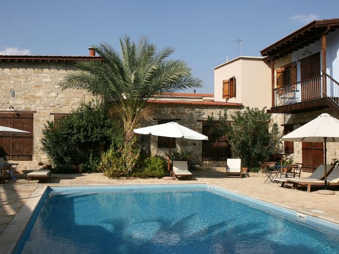 Hera apartment is one of two fully serviced self contained apartments in a beautiful country house which is located in the hillside village of Choirokoitia. The two-storey stone-built property with its traditional architecture, décor and blossoming greenery revives the spirit and atmosphere of bygone days. Modern amenities are delicately woven into a tranquil setting and designed to be an escape from the outside world. A one bedroom first floor apartment that sleeps 2/3 guests with a sofa bed in the living room to accommodate a third person, a modern bathroom with shower, kitchen and a large veranda plus air conditioning (heating/cooling), WiFi, electric hob/oven, fridge, kettle, toaster, coffee machine, villeroy boch china ware, hairdryer and a safe. The apartments surround and overlook the private courtyard with a shared swimming pool and a spacious sunbathing deck for relaxing whilst enjoying the Cyprus sun!