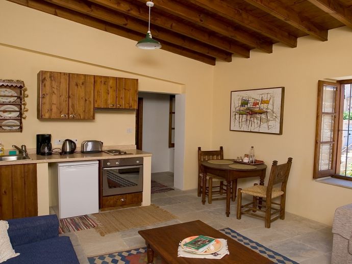 Villa Ermioni is one of two beautiful country houses located in the hillside village of Choirokoitia. The two-storey stone-built property with its traditional architecture, décor and blossoming greenery revives the spirit and atmosphere of bygone days. Modern amenities are delicately woven into a tranquil setting and designed to be an escape from the outside world. The villa sleeps 4/6 guests and comprises of 2 self contained apartments making it a perfect choice for families or friends wishing to holiday together but still have privacy at the same time. Each apartment has one bedroom, a modern bathroom with shower, kitchen and a living room with a sofa bed to accommodate 1 extra guest in each plus a terrace and large first floor veranda. They have air conditioning (heating/cooling), WiFi, electric hob/oven, fridge, kettle, toaster, coffee machine, villeroy boch china ware, hairdryer and a safe. The house overlooks the courtyard with shared swimming pool and spacious sunbathing deck for relaxing whilst enjoying the Cyprus sun!