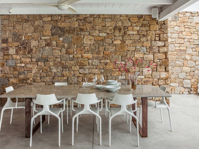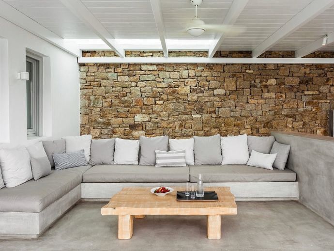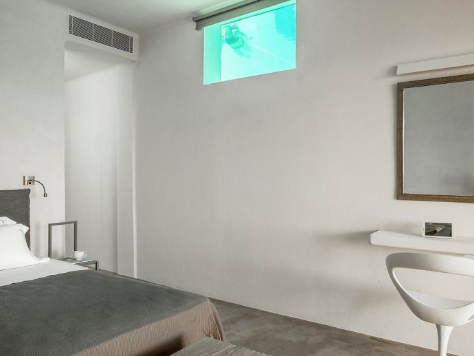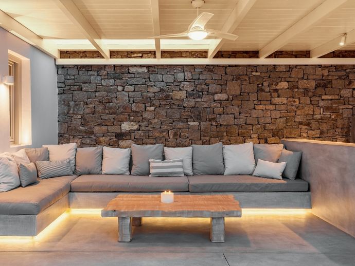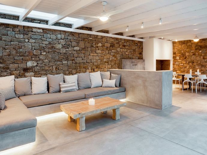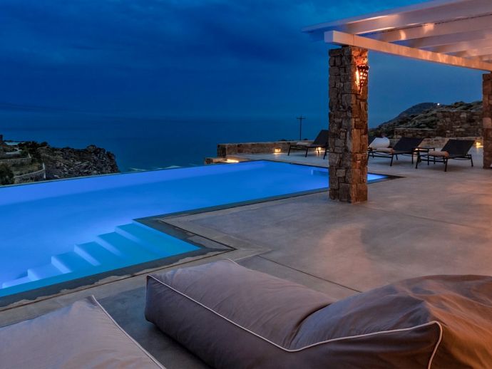 Villa Kosma is a fantastic holiday home with stunning views to the deep blue waters of the Aegean sea and just a short walk (300 meters) to one of the most beautiful beaches in Mykonos. This newly built villa is contemporary in design but captures the natural elements of the island creating a delicate atmosphere of modern luxury fused with a pure and refined traditional creation. Both the exterior and interior was created using material of the highest quality, designer furniture, state of the art technology and equipment providing an experience of simplistic sophistication. The villa sleeps 14 guests in 7 spacious bedrooms all with en-suite bathrooms and the living area comprises of an expansive open plan living room with dining area and a modern fully equipped kitchen plus a private gym, guest toilet, staff and storage room. There is an abundance of outdoor space with an inviting private infinity pool, Jacuzzi, lavish sun beds, a covered lounge with corner sofas, dining area, barbecue and a bar for entertaining at any time of the day whilst enjoying the unsurpassed panoramic sea views.