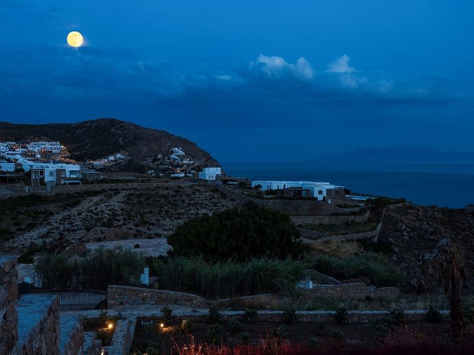Bedrooms: 7 Sleeps: 14Villa Kosma sits in an elevated position with breath taking views to the deep blue waters of the Aegean Sea and only 300 meters from the beach. Elia is one of the most beautiful beaches in Mykonos with its beautiful waters and unique sand, it's also organised with restaurants, bar, coffee places and water sports. The villa is just 1 km to Elia beach (driving) and 3 km away from the beaches of Kalo Livadi and Kalafatis. Just next to Elia beach is the Agrari beach, famous for its tranquillity and its beautiful sand. The picturesque village of Ano Mera with its unique monastery is located 3 km away where you can find, apart from taverns, patisseries etc, a large supermarket, a bakery, a kiosk and a pharmacy for your supplies. The shops are usually open from morning until late evening.