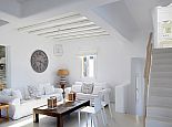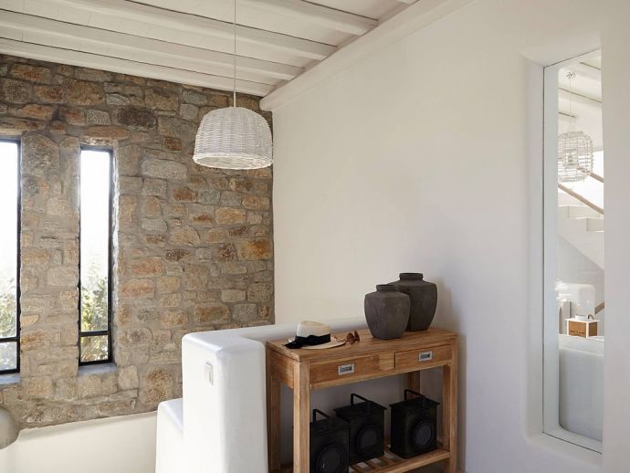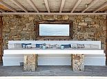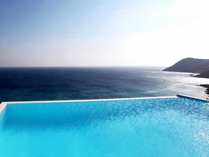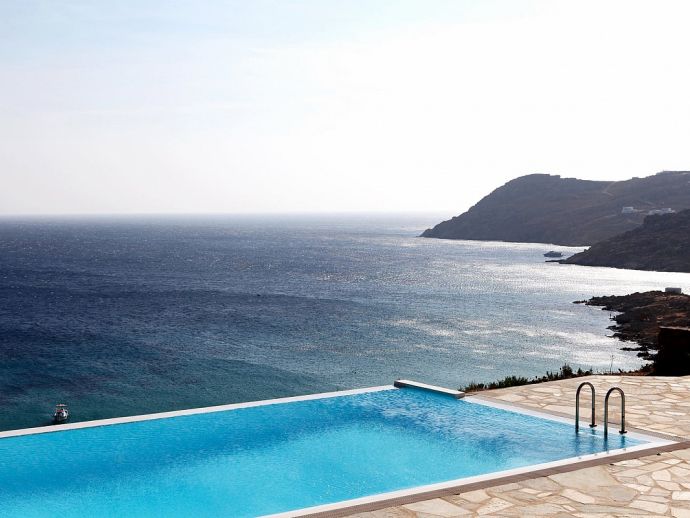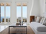 Elida Villa is a contemporary summer residence with panoramic sea views situated in the highly sought after area of Elia beach. The white minimal interior of the house with smooth curved edges and simple decoration creates a relaxing ambience and enjoyable atmosphere. Distributed over 3 levels the villa sleeps 10 guests, on the upper level is a guest bathroom (w/c) and a fully equipped kitchen which is adjacent to a spacious living area with dining table, stairs lead up to a master en-suite with king size bed designed with sea views from every angle emulating the feeling of floating on a boat. On the ground floor there is another master bedroom with king size bed and en-suite bathroom and on the lower level is a second sitting area and 3 bedrooms with en-suite bathrooms (2 twins/1 double). The views from all corners of the house are uninterrupted no matter if you are inside or outside as it has been built with the concept of having constant eye contact with the sea. The infinity pool is stunning, here the overflowing pool water merges into the blue of the sea and becomes a spectacular myriad of colours when the sky changes during the dramatic sunrise and sunset. These great views can be enjoyed from the different areas, sitting in the various lounges, from the sunbeds on the extensive veranda or from the barbecue and outdoor bar next to the pool (the pool area is very large and can host events for 150 people). Apollo villa harmoniously blends together elements of stone, white colour walls, and water and it would be hard not to be impressed by the breathtaking and unobstructed views of the sparkling blue waters and rocky coastline.