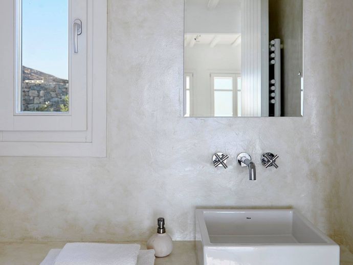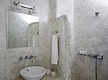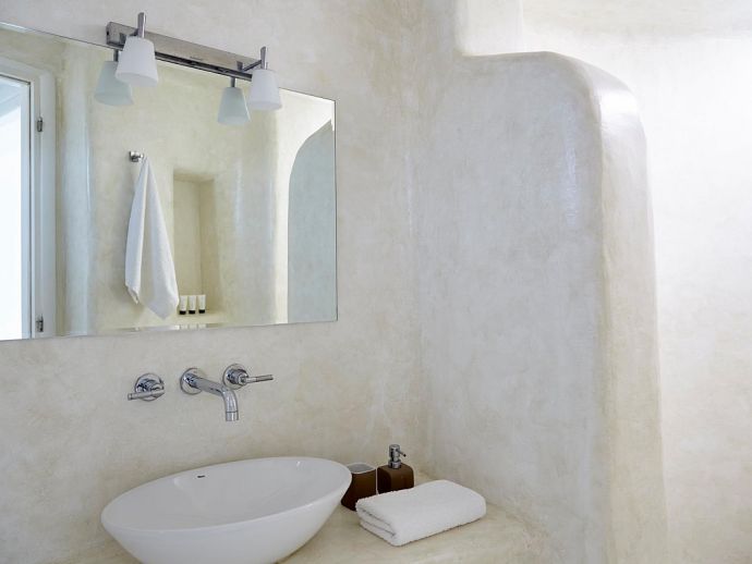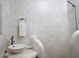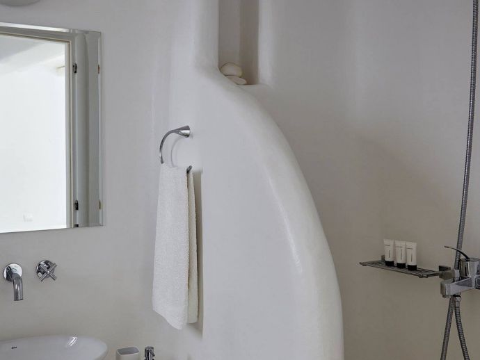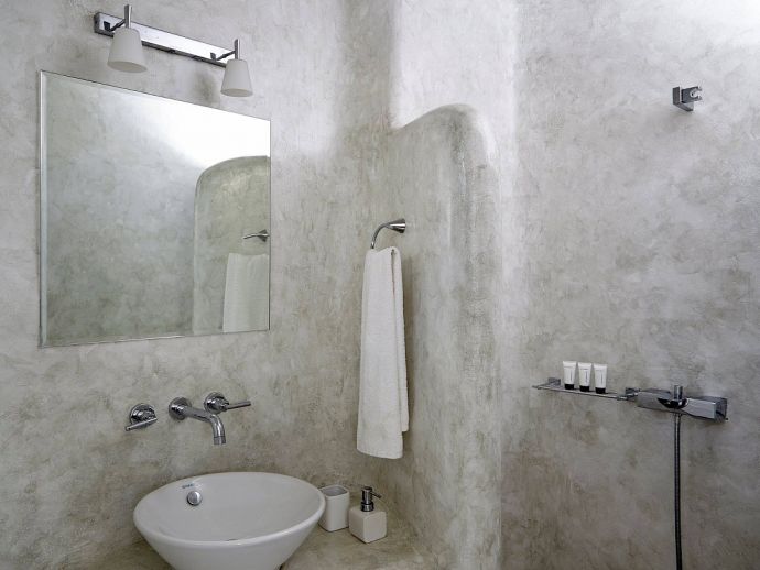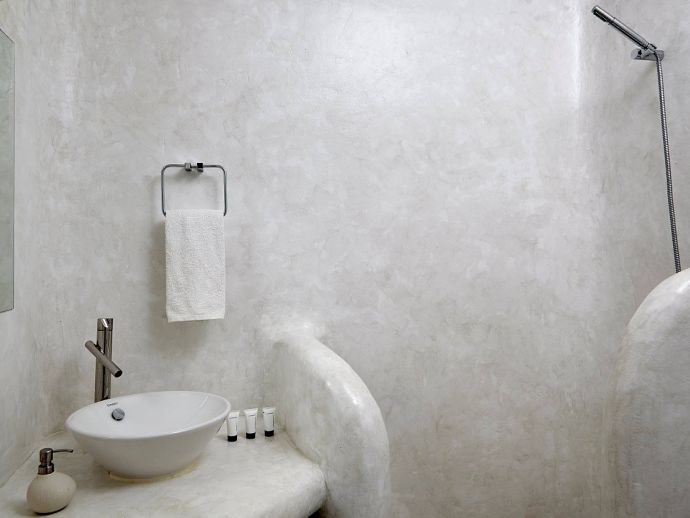 Bathrooms are made of polished cement with smooth curves and light colours.