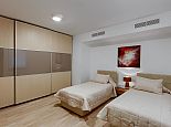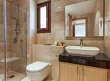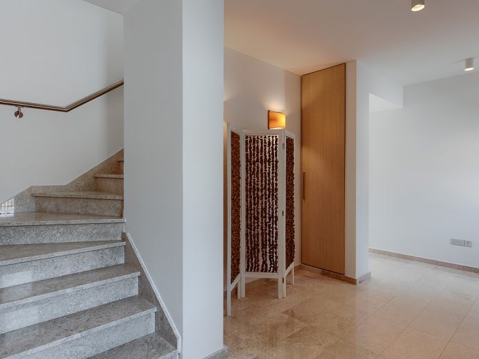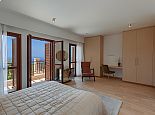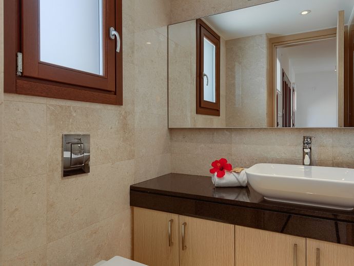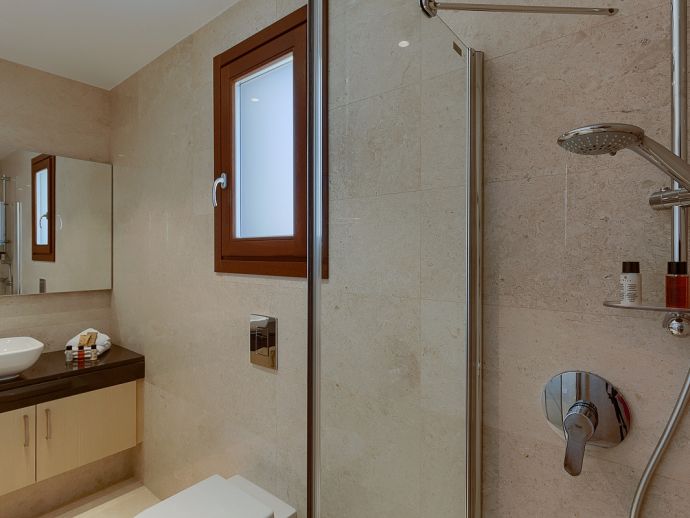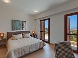 The marble staircase leads up to the first floor, with three more bedrooms and even more wide-sweeping sea views from the front of the property overlooking the pool. The master bedroom is spacious, with beautiful modern furnishings giving a true sense of comfort and elegance. Featuring a light brown king-size bed with mirrored matching furnishings and shuttered French doors opening out to the balcony from where one can take in the panoramic views, and a luxury en-suite bathroom which is fully tiled in granite offers twin washbasins, WC, bath and separate shower.