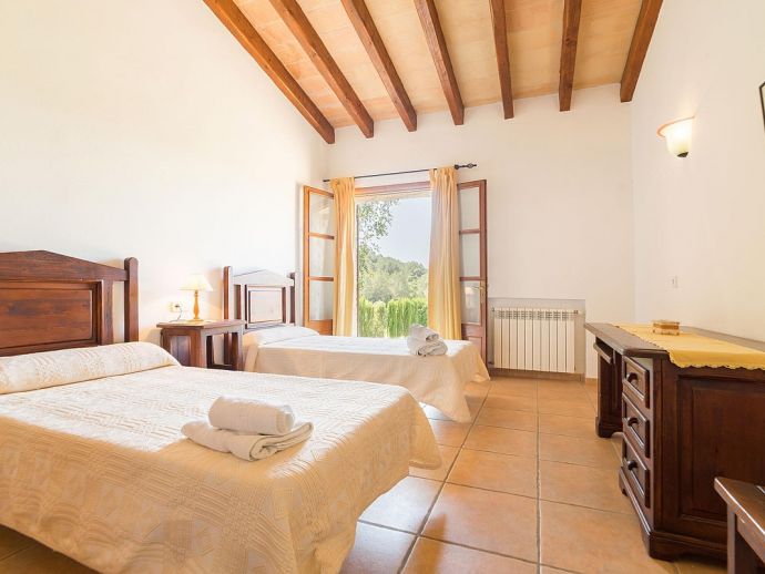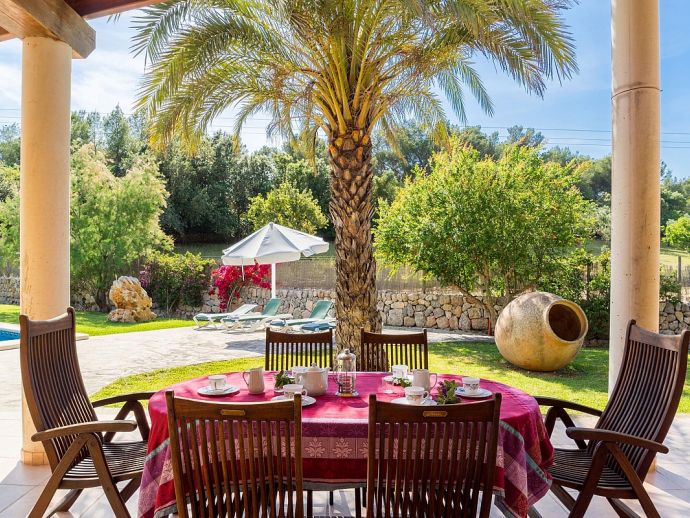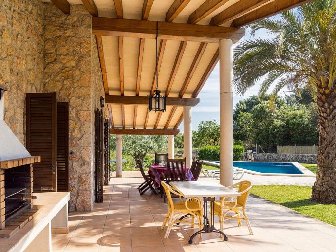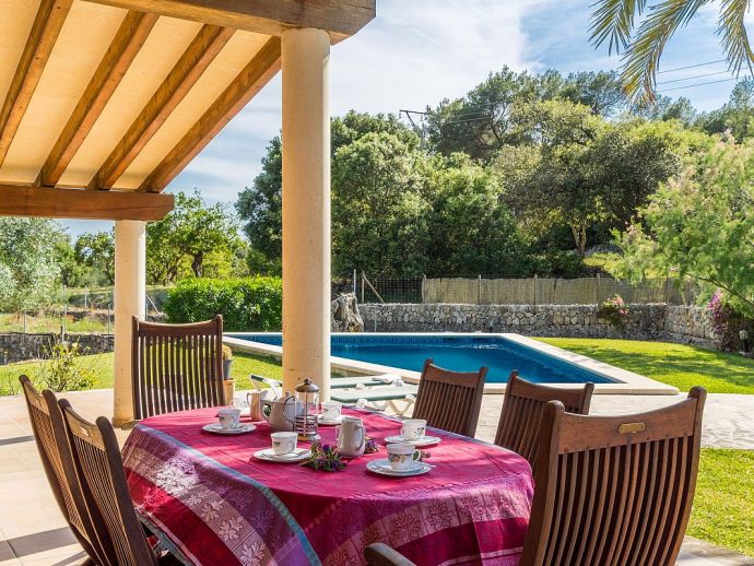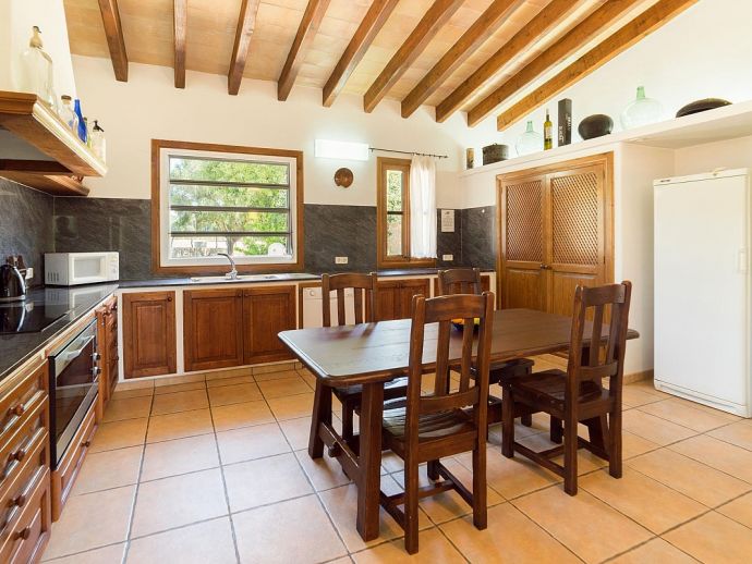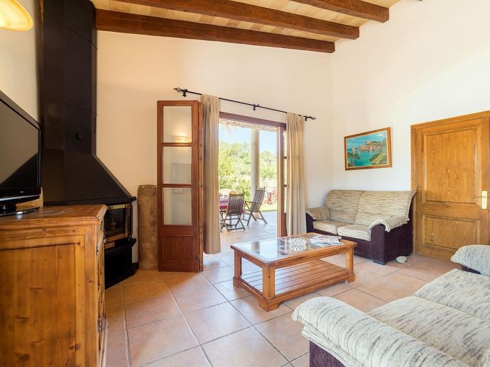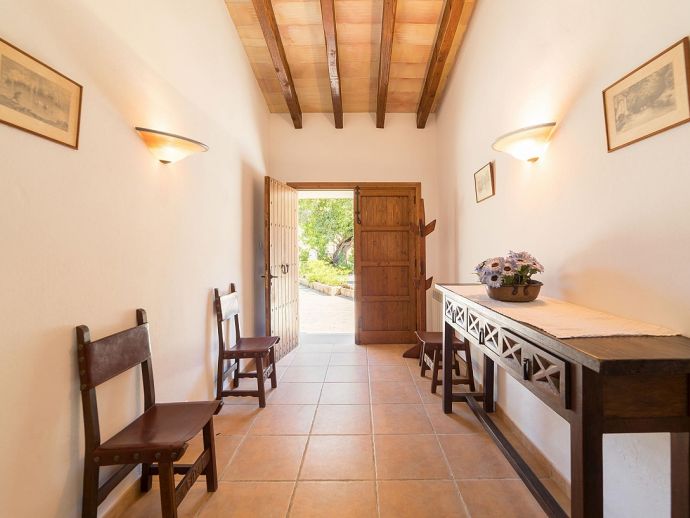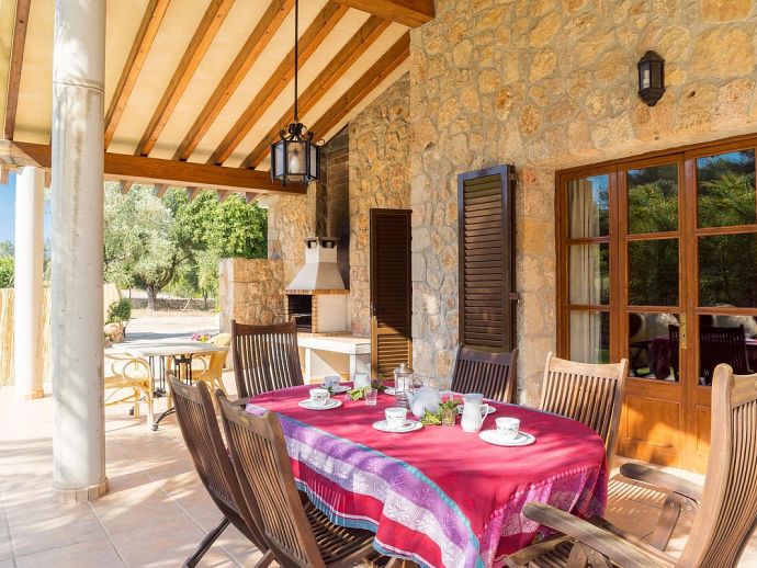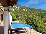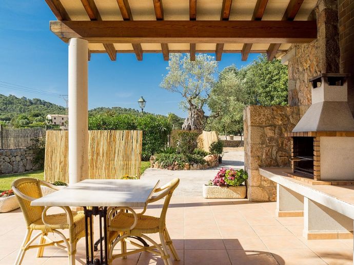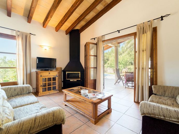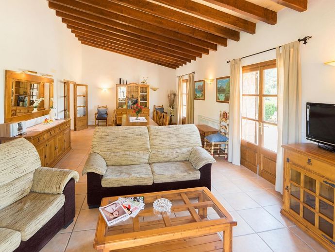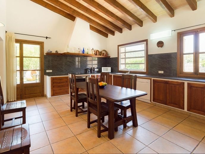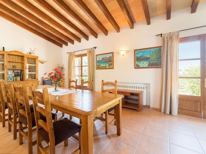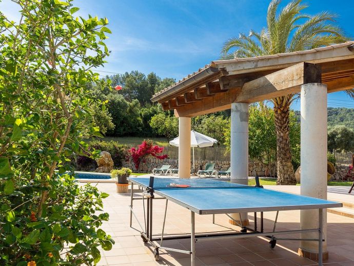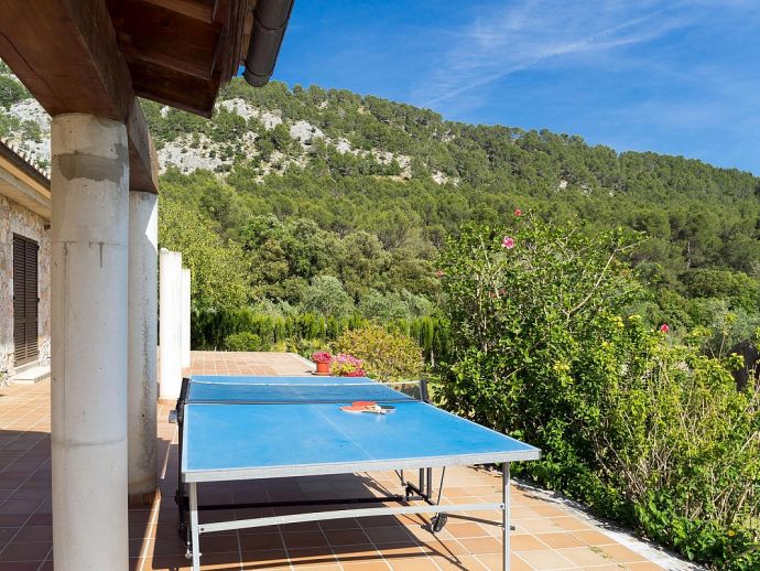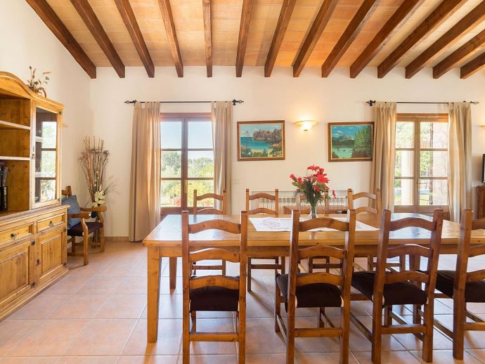 Casa Laura is a lovely single storey holiday villa with private pool, situated in a quiet rural neighbourhood with beautiful views to the mountains and ideally placed to reach the nearby towns and beaches of Pollensa and Puerto Pollensa. The property offers spacious accommodation with 3 bedrooms, 2 bathrooms and accommodates 6 people. The interior has many traditional features, wooden beamed ceilings, tiled floors, fireplace and modern amenities have been added, all bedrooms feature air conditioning and central heating, there is Satellite TV (Languages: Spanish, English, German) and Wi-Fi is available. The kitchen is fully equipped with appliances, breakfast table and the large open plan living space incorporates a dining area plus comfortable seating which is positioned around a wood-burning fireplace. This large room is flooded with natural light with 4 sets of double doors that open out to the garden and a 60 m² covered terrace with stone-built barbecue and dining furniture. Casa Laura sits on a fenced plot surrounded by trees and nature providing peace and privacy for bathing in the private swimming pool, relaxing on the sun loungers or playing table tennis in the pretty garden whilst enjoying the mountain views, it’s an ideal place to spend memorable family holidays.