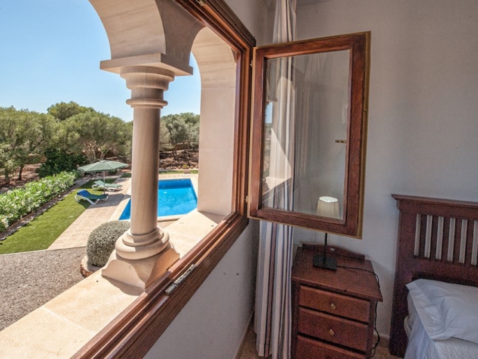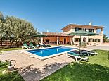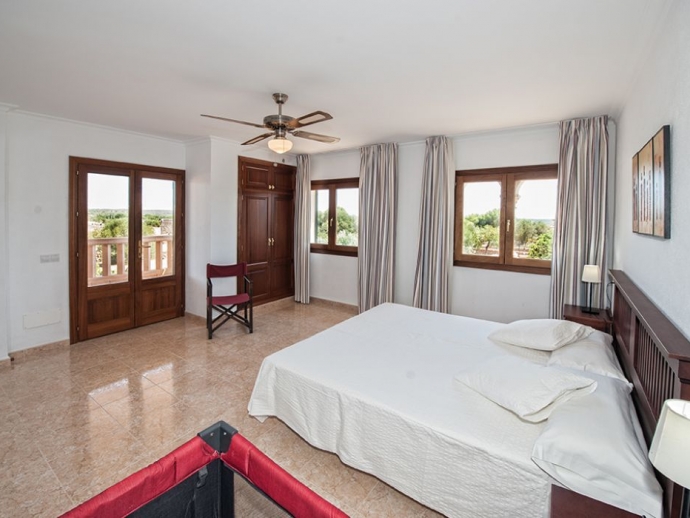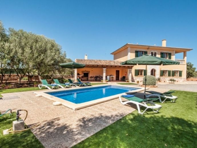 Very comfortable and newly built villa with 3 double bedrooms to accommodate up to 6 persons. All 3 bedrooms dispose of air conditioning. On the ground floor there´s the living room with dining area, the ceiling is decorated with arches of Santanyi stone, a typical material for this area. Next to the living room is a spacious and fully equipped kitchen with its own dining space and separate exit to the pool area. Also on the ground floor is a double bedroom, a bathroom with bathtub and a guest bathroom with toilet. On the first floor there is 2 more double bedrooms and a bathroom. A cosy terrace with garden furniture offers panoramic views over the neighbouring country side. The private pool (8 x 4 meters - depth: 0,80 - 1,80 m) is equipped with sun loungers and umbrellas and has an outdoor shower. Next to the pool is a covered terrace with brick built barbecue and tables and chairs for grilled meals in open air.