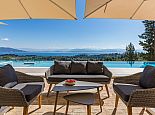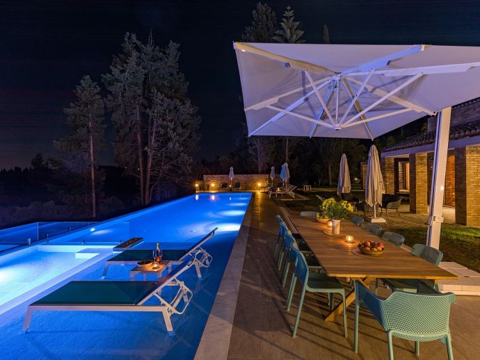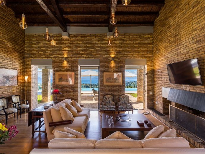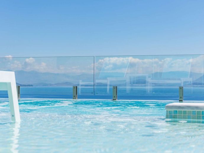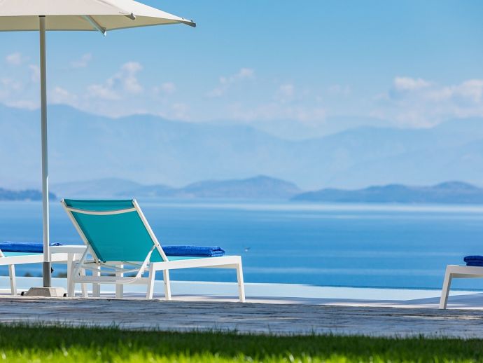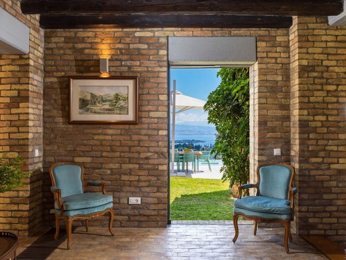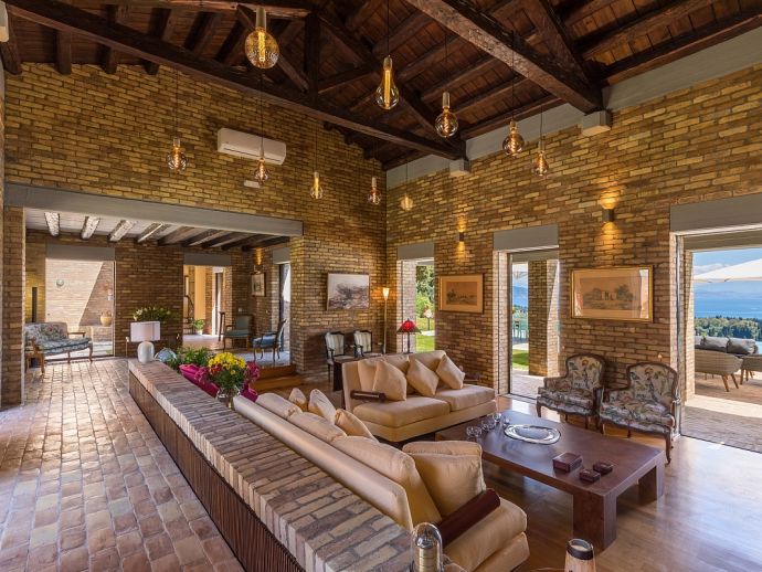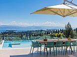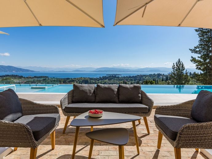 Villa Aurore is a luxurious and beautifully presented holiday home with breath-taking 180⁰ sea views that stretch out over Gouvia Marina. The villa accommodates 8/10 guests and is built of traditional solid brick which is exposed in most exterior and interior areas, giving a rustic and warm feeling whilst the plush seating and designer furniture add an elegant touch throughout. Finished to the highest of standards you are provided with plenty of luxury extras in the 4 bedrooms and en-suite bathrooms, the kitchen is fully equipped with appliances and the living area is spacious with high ceilings and doors that connect you to the outside and the stunning views. The setting is idyllic with extensive patios and outdoor lounging/dining areas plus a large heated swimming pool with Jacuzzi section and a built-in platform for sun loungers. For many this haven alone is already the formula for a perfect holiday but it's central location also means that for others the attractions of Gouvia Marina, the historical old town Corfu and nightlife can easily be reached in just a short drive.