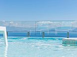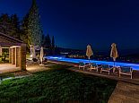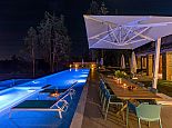 Heated infinity swimming pool (22 x 5 meters) including Jacuzzi section and platform for sun loungers.