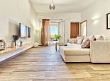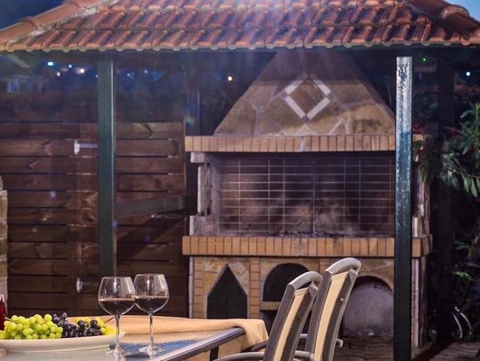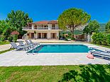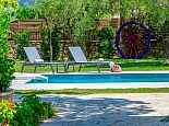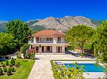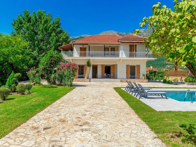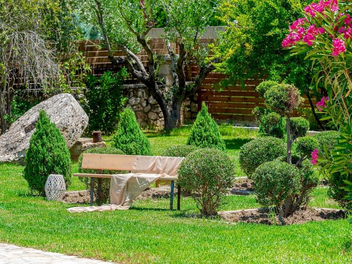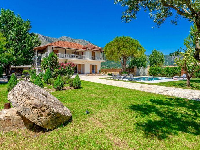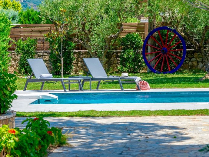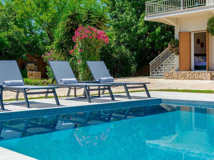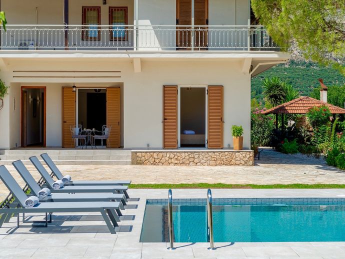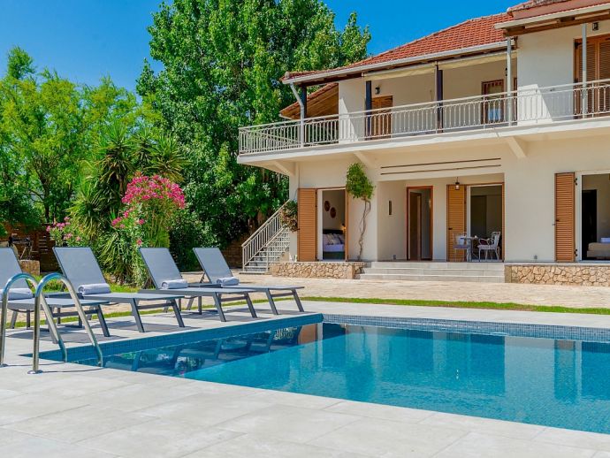 Villa Kyriakos is a spacious holiday home with a private pool and extensive gardens, surrounded by trees, vineyards and mountains and perfectly located just outside the famous seaside resorts of Alykes and Alikanas. The villa can sleep up to 11 guests in classy, stylish interiors which have been totally renovated yet are still rich with traditional features. The whole property (bedrooms and common areas) is air-conditioned and the beautiful terraces are shaded and provided with side covers so can be enjoyed even during the beginning or end of the season. The accommodation is distributed over two floors; on the ground floor is, a comfortable spacious lounge, a purposely built fully equipped kitchen and 3 double bedrooms with en-suite shower rooms. The upper floor is reached via an external staircase where there are 2 further bedrooms, a double and a twin that share a family bathroom, a useful second lounge area with a sofa-bed perfect for welcoming the 11th guest as well as a kitchenette. Outside, Villa Kyriakos is a true oasis within the beautiful Mediterranean nature, there are plenty of mature trees, shrubs, flowers, paved terraces and gardens with lawn. A covered dining area with a brick-built barbecue is available for delicious meals and plenty of seating areas are available all around the grounds. The newly added private swimming pool is equipped with comfortable loungers and at night the pool is beautifully lit creating a perfect atmosphere for memorable evenings spent on holiday with family or friends.