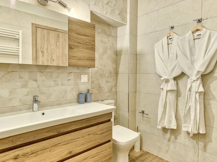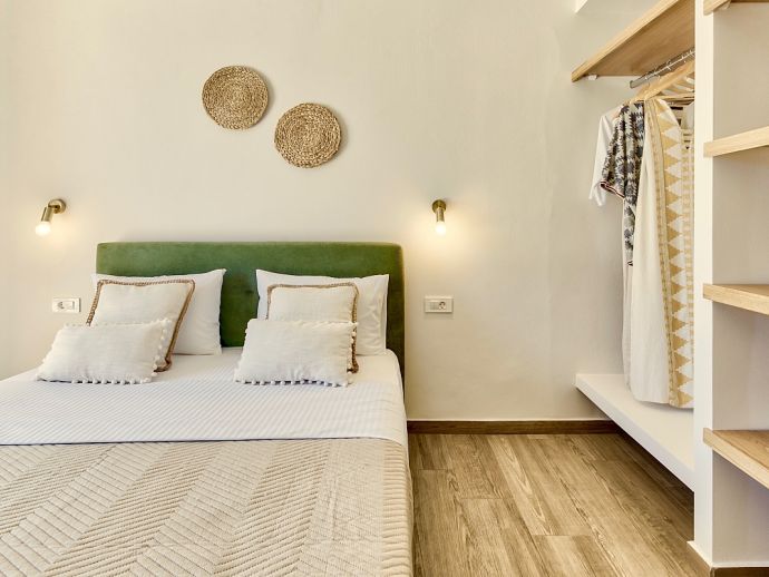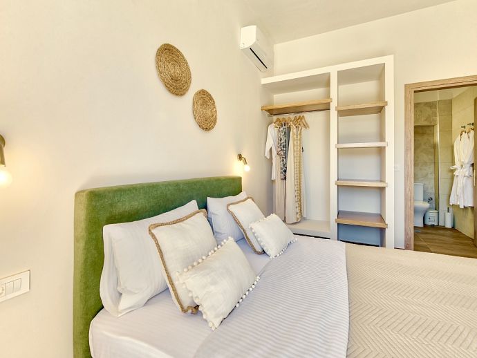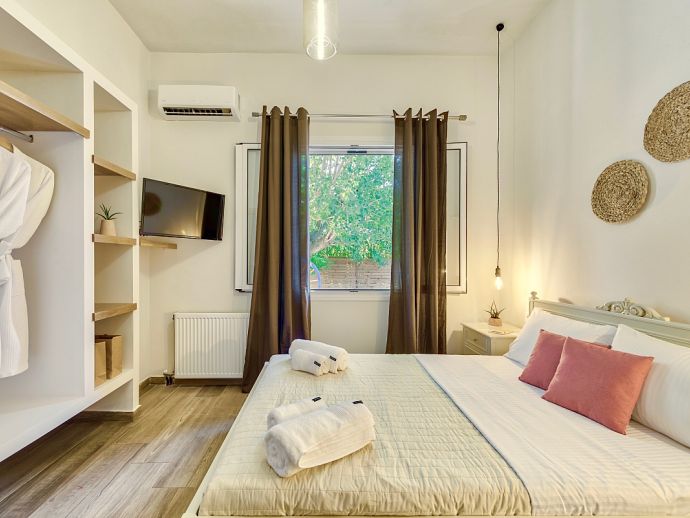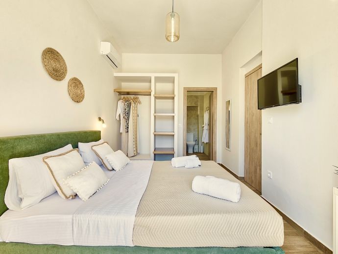 Double bedroom, A/C, satellite TV, en-suite shower room, access to garden/pool.