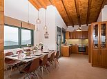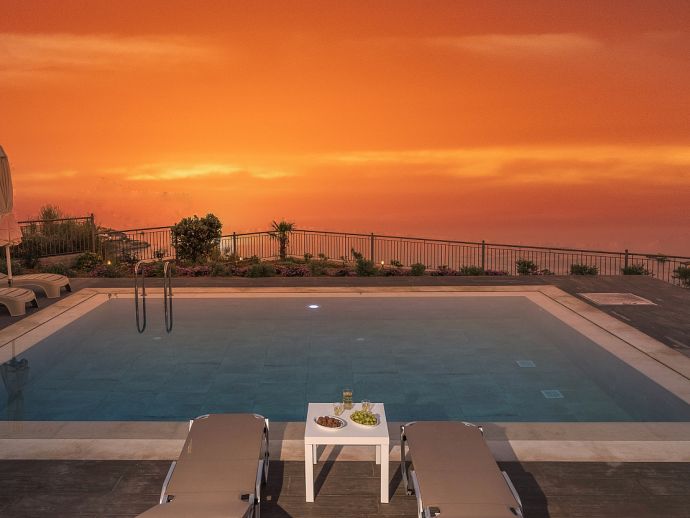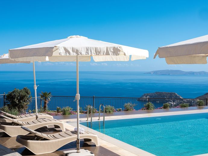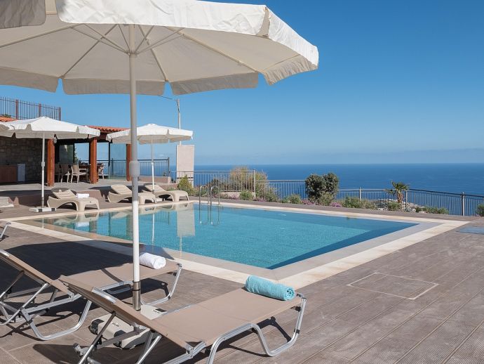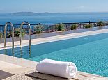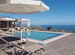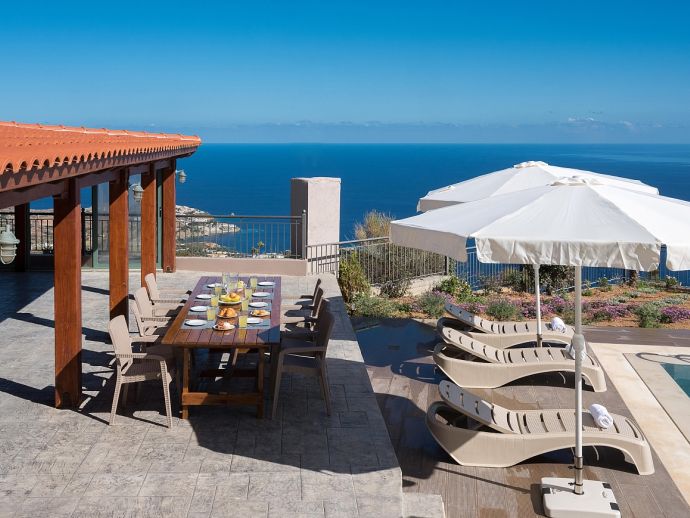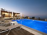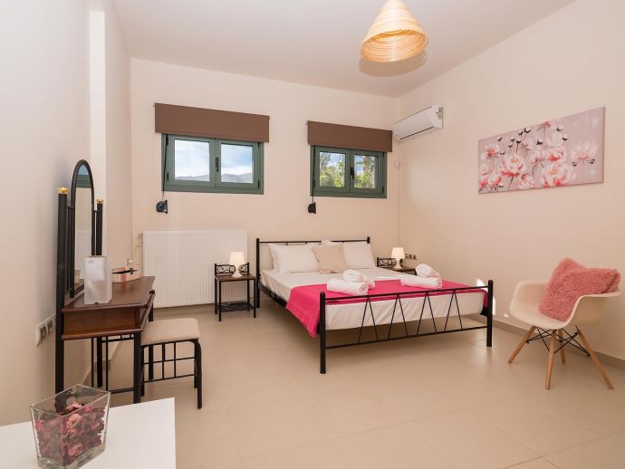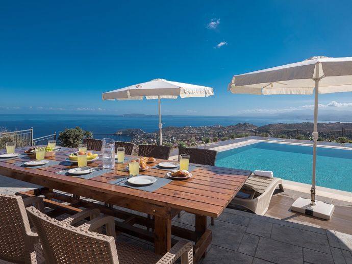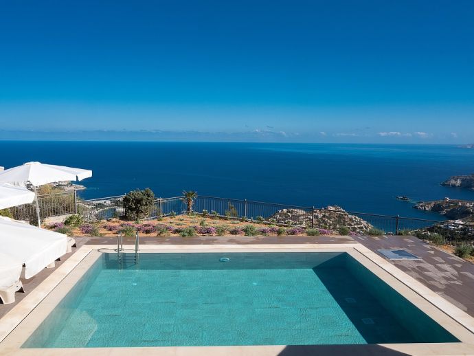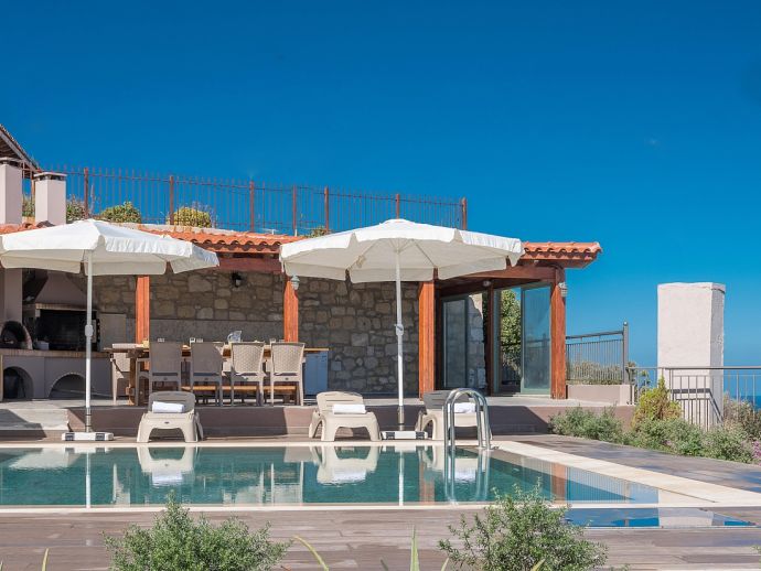 Villa Arianna is a modern family holiday home with a private pool that is situated in a privileged panoramic location providing views across the bay of Agia Pelagia and to the Mediterranean Sea. The villa sleeps 6/8 guests in fully air-conditioned and spacious interiors of 200 m² that are distributed over two floors. On the main floor (entrance level), is an open plan living space incorporating a fully equipped kitchen, a comfortable lounge and a dining area with picture windows that frame the amazing views and glass sliding doors to a sea-facing terrace. Also on this level is a guest toilet, a large double bedroom with an en-suite shower room and a huge bedroom that has a mezzanine level with a double bed above and a double sofa bed below as well as a private bathroom, ideal for guests with children. The third bedroom with a private bathroom is on the lower floor and has an adjoining room that can be used as either a private lounge area or as a playroom for children. Outside there is parking for up to 4 cars and the villa is surrounded by lush gardens and extensive terraces providing the most sensational sea and sunset views. The large, private pool is equipped with comfortable sunbeds and parasols for relaxation and for the lovers of al fresco dining there is a big outdoor kitchen with a built-in barbecue/wood oven and dining area. Villa Arianna offers stunning views, easy access to the lovely beaches and resorts of Agia Pelagia and Lygaria and is an excellent choice for a memorable holiday experience in Crete!
