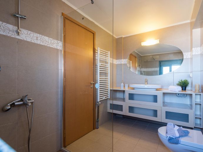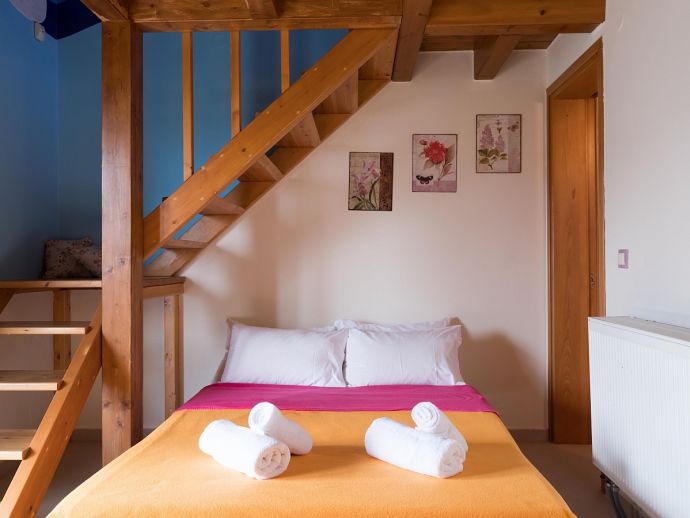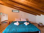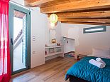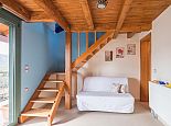 Bedroom: 1 x double bed, A/C, attic level, 1 x double sofa bed, A/C, lower level, exit to balcony - The bedroom has a private shower room and is split over two levels with a mezzanine floor.